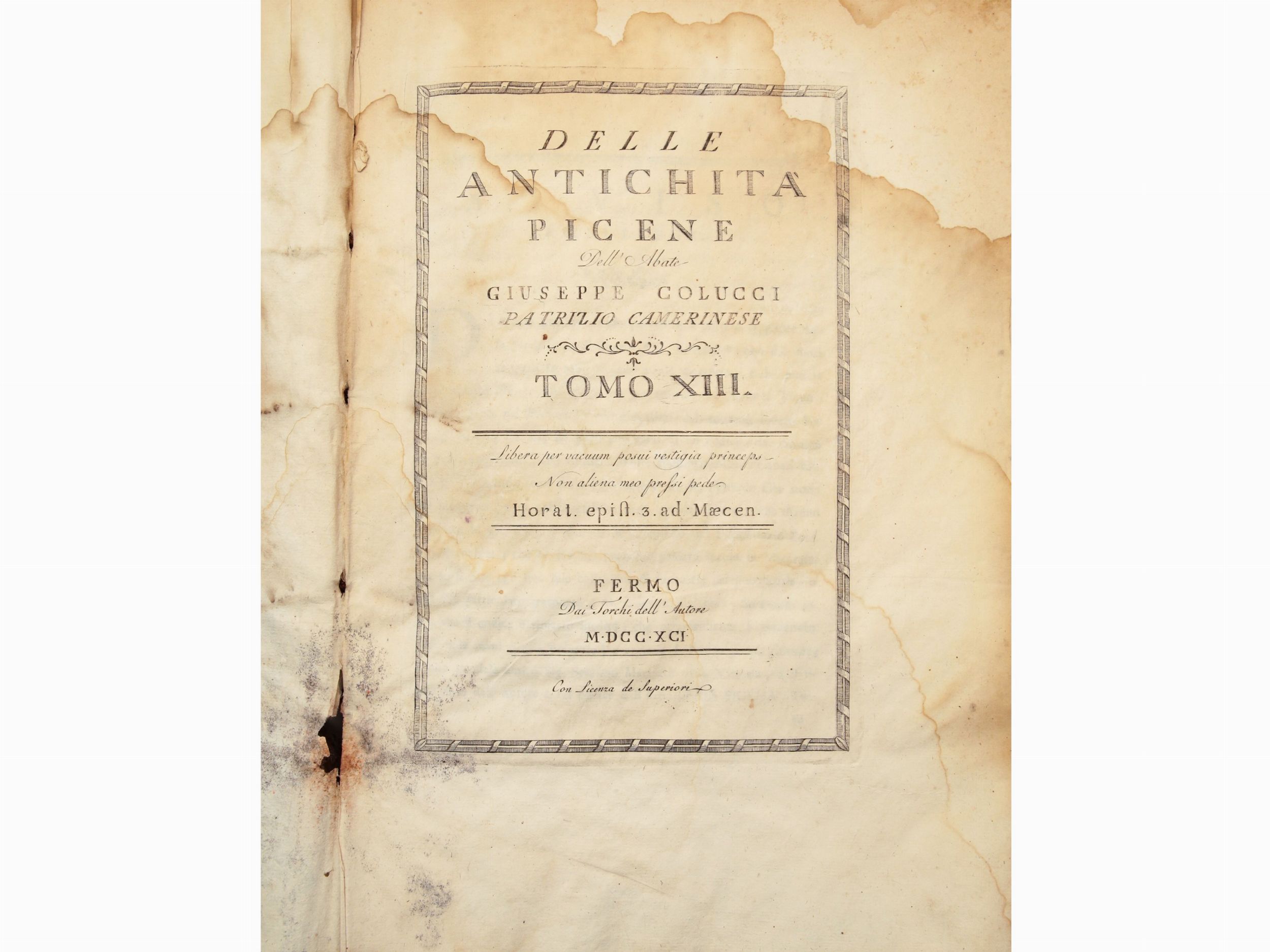 Fermo: Dai Torchi dell'Autore, 1791, Tomo XIII (di 31). In folio (360x240 mm). XVI, CLVIII, 131, [1] p., 1 c. di tav. ripiegata. Collazionato, completo. Segnatura: [a]4 b4 a-u4 A-2F4. Belle iniziali e testatine incise, finalini xilografici.