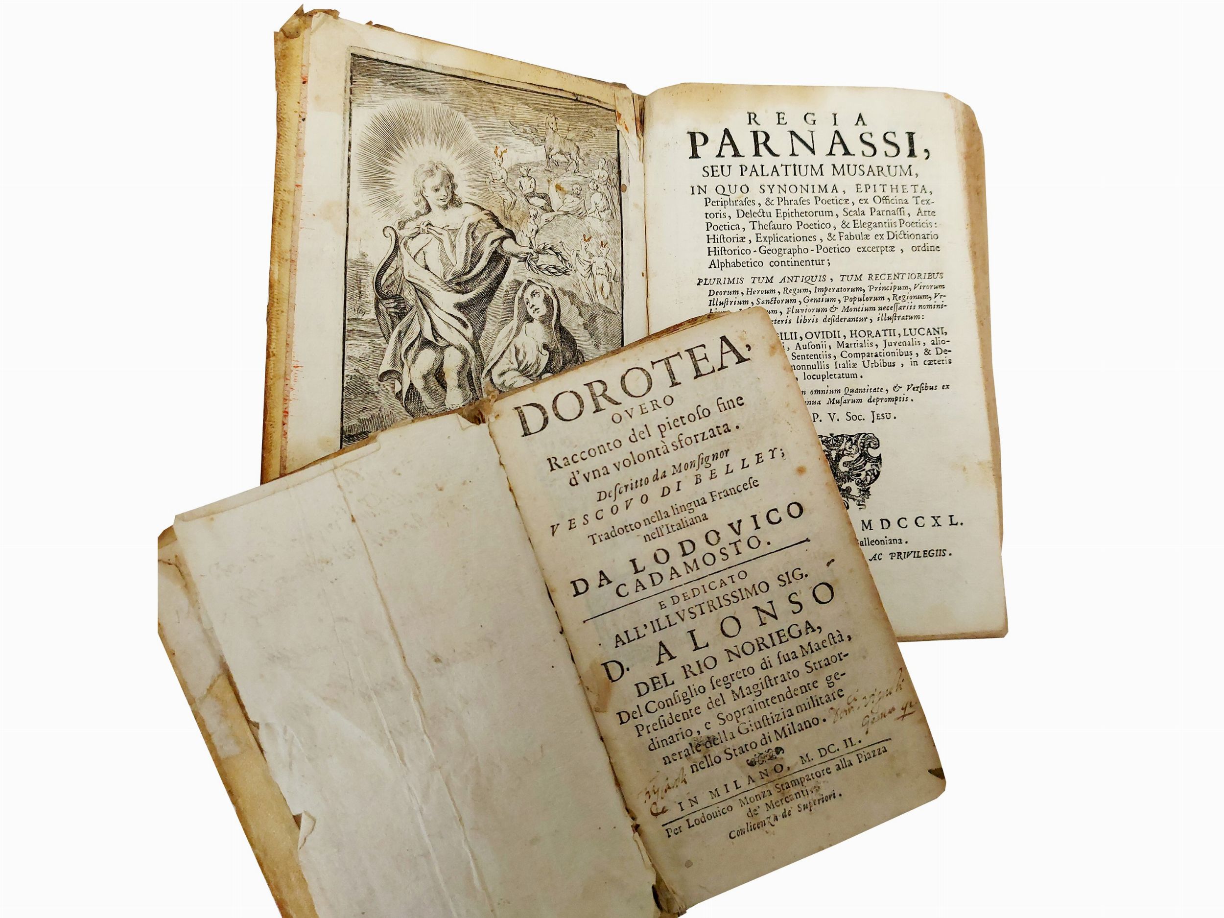 - Vanière, Jacques, Regia Parnassi, seu Palatium Musarum, Venetiis: ex Typographia Balleoniana, 1740. In-8° (175x110 mm). [36], 852 p. Tav. all’antiporta. Legatura in piena pergamena, carta con gigli applicata al dorso, mende agli angoli. Fioriture, gore, mancanze (2)