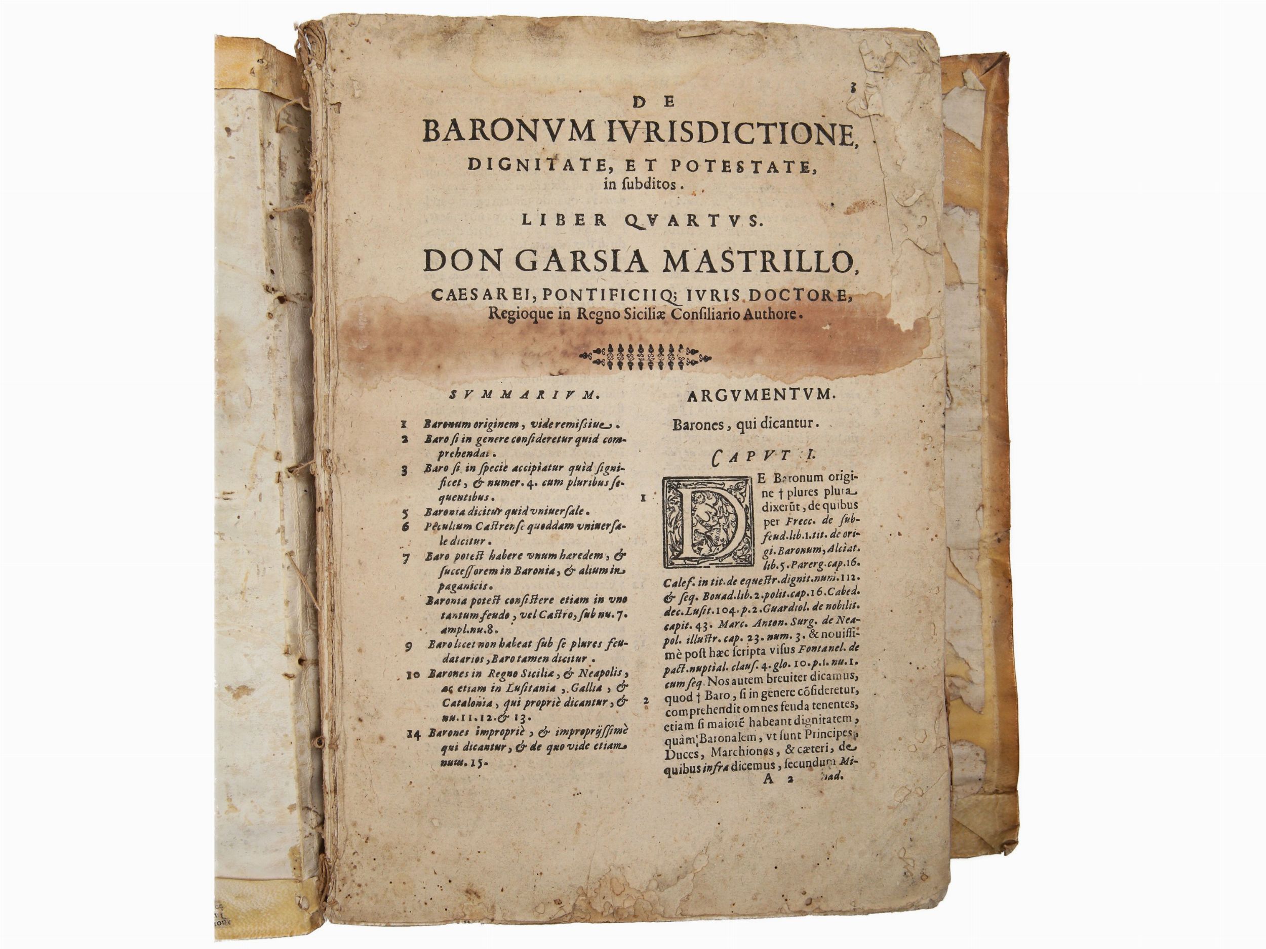 [De magistratibus eorum imperio, et iurisdictione. Pars II], Panormi: apud Franciscum Ciottum Venetum, 1616], 3-303 p., 12 p. (Index). In-2° (295x220 mm). Testo su due colonne. Iniziali e fregi xilografici. Legatura coeva in piena pergamena con titolo calligrafico su cartiglio al dorso, evidenti strappi e mende. Ai piatti fori di cadute bindelle. Legatura fortemente allentata. gallerie di tarlo, fioriture, gora d'acqua, staccate le pagine finali contenenti gli Indici. Esemplare privo del frontespizio e di una consistente parte del volume (178 p.) contenenti Ad indultum generale commentarius Catholici Philippi III (2)