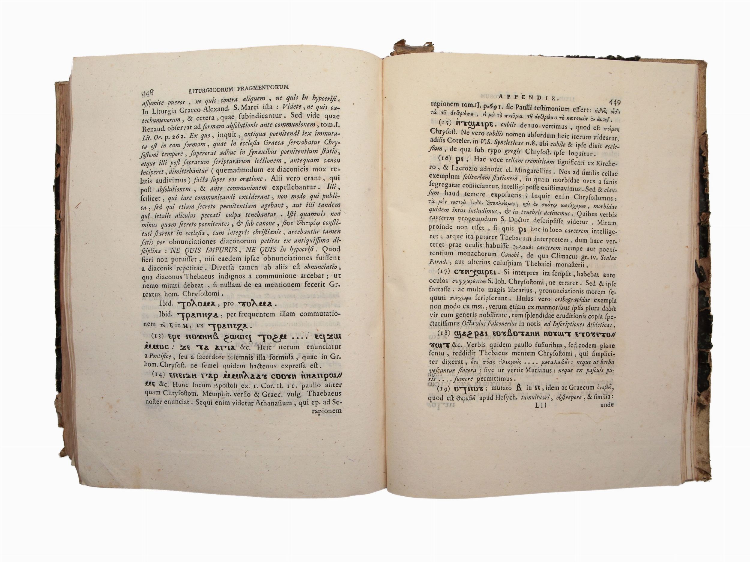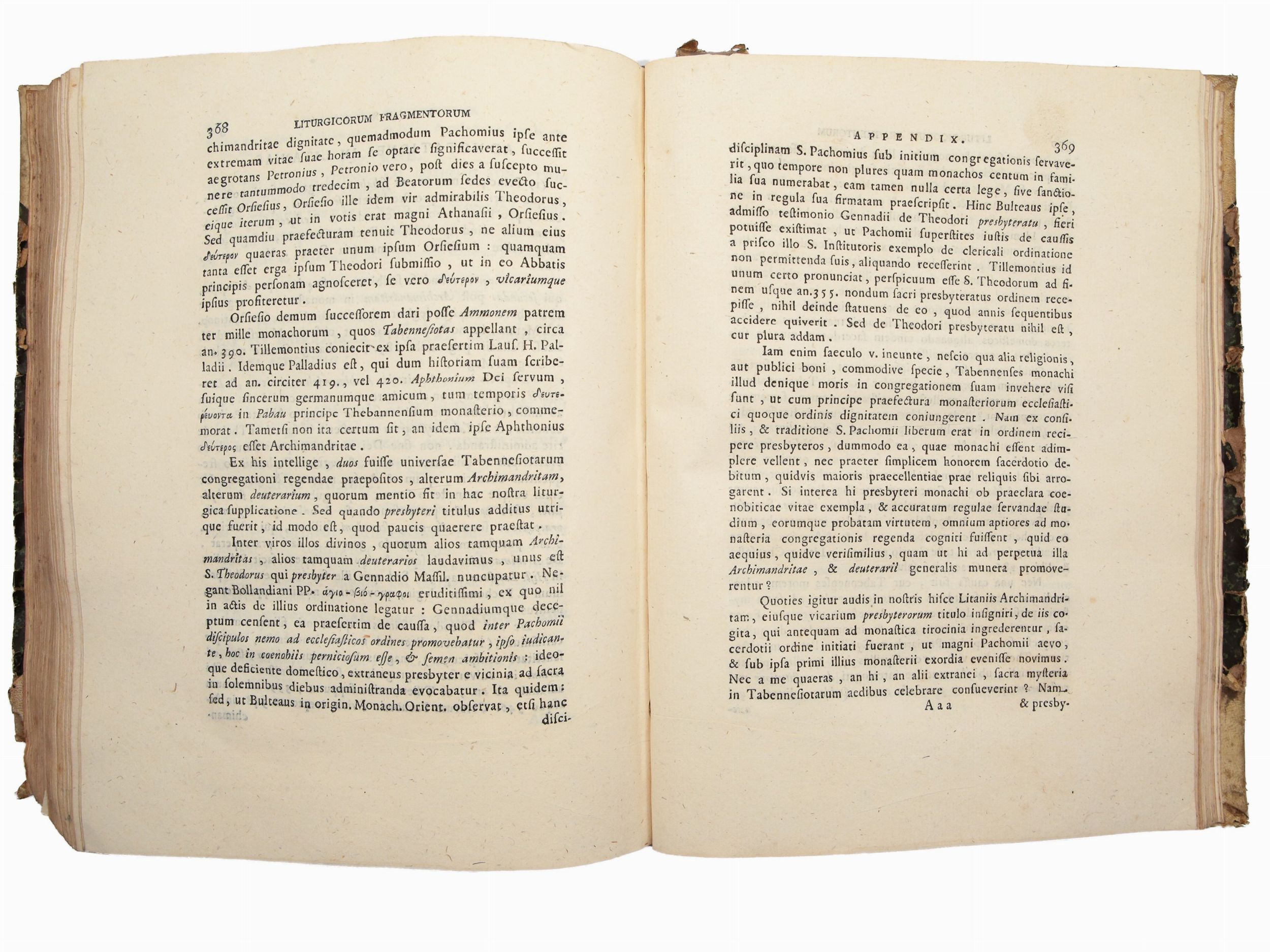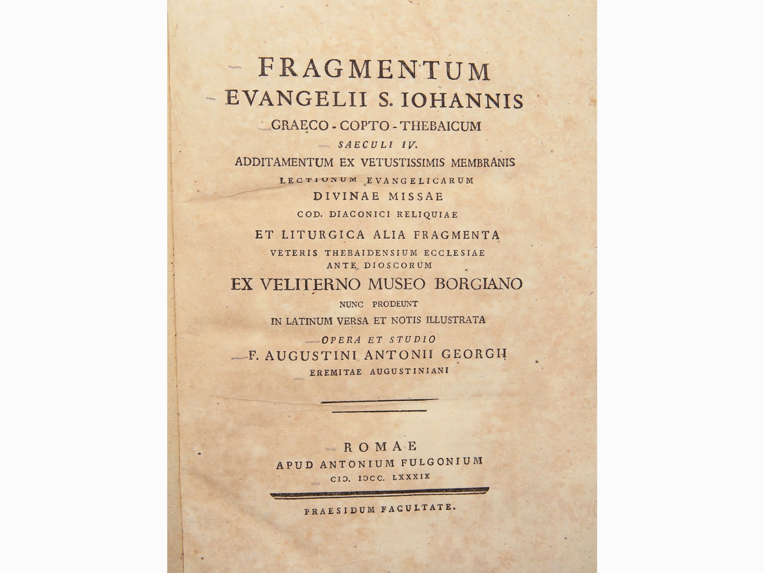 Romae: apud Antonium Fulgonium, 1789. In-4° (280x220 mm). CXCII, 488 p., 4 tav. Iniziali xilografiche. ...additamentum ex vetustissimis membranis lectionum evangelicarum divinae Missae cod. diaconici reliquiae et liturgica alia fragmenta veteris thebaidensium ecclesiae ante Dioscorum ex Veliterno museo Borgiano nunc prodeunt in Latinum versa et notis illustrata opera et studio F. Augustini Antonii Georgii eremitae augustiniani. Legatura coeva in mz. pergamena con angoli, con titolo su tassello al dorso, con difetti: mancanze al dorso, all'angolo del piatto anteriore e ai labbri. Fioriture, zone uniformemente brunite. Macchia a p. 388