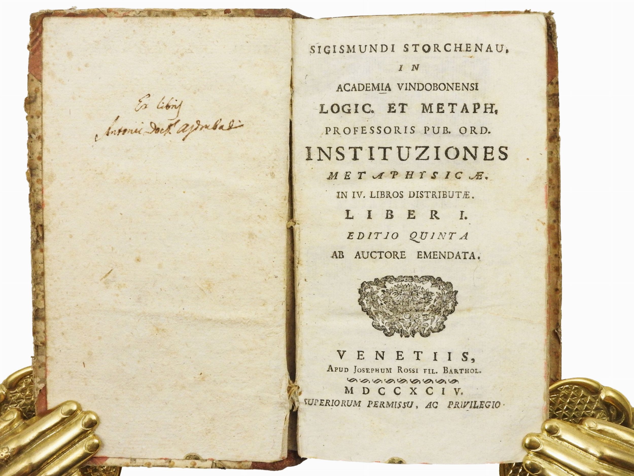 Editio quinta ab auctore emendata, Venetiis: Apud Josephum Rossi fil. Barthol., 1794, 4 pt. in 2 voll. + 1 vol. In-12° (170x95 mm). Institutiones metaphysicae: 228 p.; 224 [i.e.204] p. (le ultime due pagine numerate erroneamente 223-224); 444 p.; 186 [i.e. 188], [4] p. (p. 188 numerata erroneamente 186; le ultime 2 c. bianche). - Institutiones logicae: iv, 302, [6] p. (bianche le ultime 3 c.). Iniziali e altri fregi xilografici. Legature coeve in mz. pelle con titoli in oro su tasselli ai dorsi. Difetti (spellature e mancanze agli angoli). Tagli marmorizzati. Minime gore d'acqua e qualche rara fioritura; nel complesso interno fresco (3)
