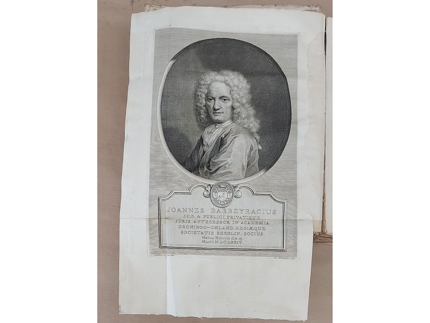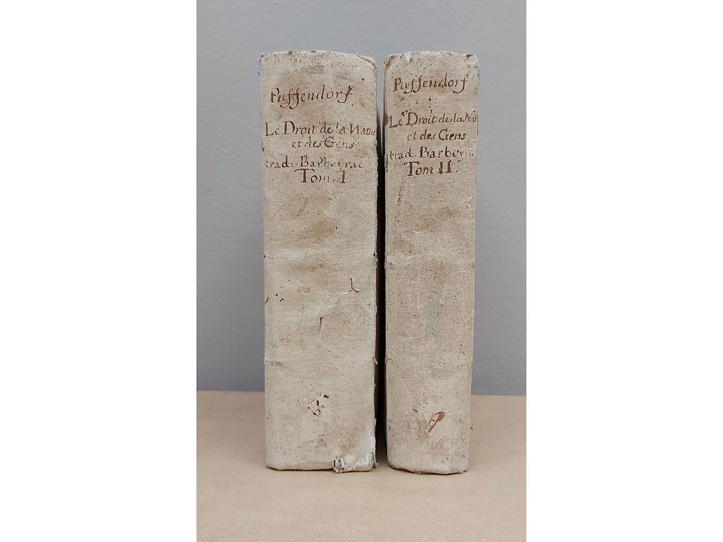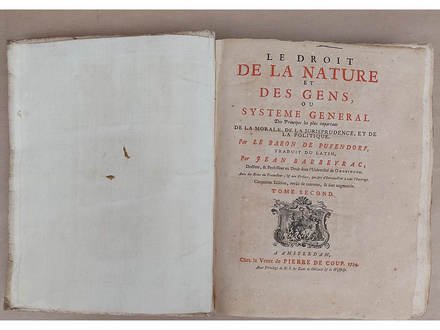 ou systeme general des principes les plus importans de la morale, de la jurisprudence, et de la politique [...] traduit du latin par Jean Barbeyrac […] Tome premier [-second] Cinquiéme edition, revûë de nouveau, & fort augmentée, A Amsterdam, Chez la Veuve de Pierre De Coup, 1734. 2 voll. in-4° (285x225 mm). XX, CXXI, [3], 716, [2] p., 2 c. di tav. con i ritratti calcografici dell'A. e del traduttore; [4], 613, [37], 52, [2] p. Contiene anche, ciascuna con proprio occhietto, Oratio inauguralis de dignitate et utilitate juris ac historiarum et utriusque disciplinae amica conjunctione, Oratio inauguralis, de studio juris recte instituendo e Oratio de magistratu, forte peccante, e pulpitis sacris non traducendo di Jean Barbeyrac. Legatura cartonata coeva, bruniture e fioriture sparse (2)