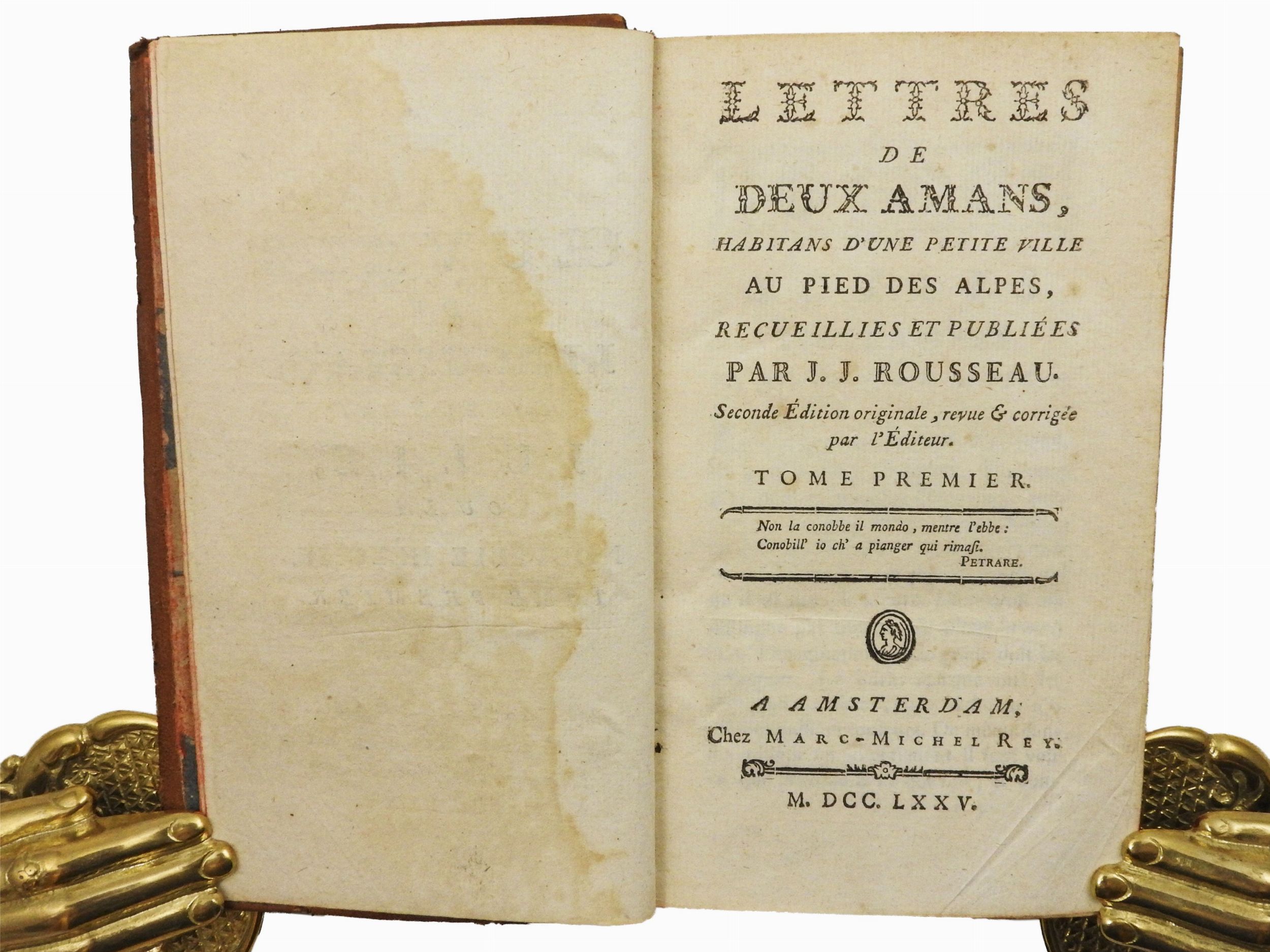 Seconde édition originale, revue & corrigée par l'editeur, A Amsterdam: chez Marc-Michel Rey, 1775, Tomi 1-4 (di 6) in 2 voll. In-12° (165x100 mm). 288 p.; 201 p.; 192 p.; 214 p. Mancanti le tav. Testatine, iniziali e fregi xilografici. Legature coeve in piena pelle con titoli e ricchi fregi dorati ai dorsi, mende alle cuffie, piccoli fori di tarlo. Tagli rossi. Gore d'acqua, fioriture (2)