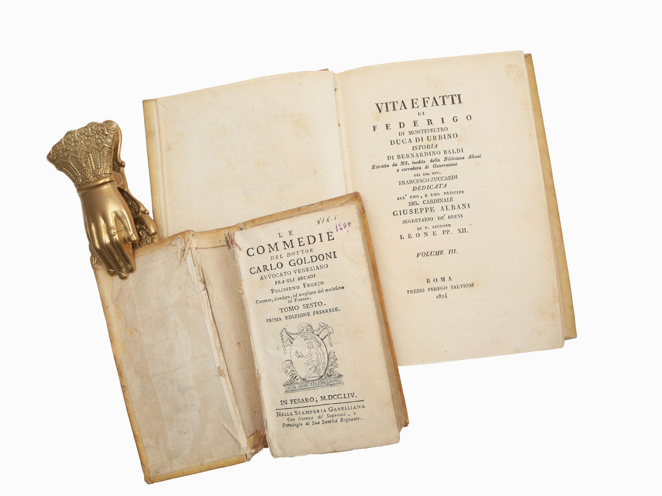 - Bernardino Baldi, Vita e fatti di Federigo di Montefeltro duca di Urbino istoria di Bernardino Baldi estratta da Ms. inedito della Biblioteca Albani, e corredata di osservazioni del sig. avv. Francesco Zuccardi, Roma: per Perego Salvioni, 1824, vol. 3 (mancanti i voll. 1 e 2). (220x150 mm). 398 [i.e. 298] p. (le p. 283-298 erroneamente numerate 383-398).