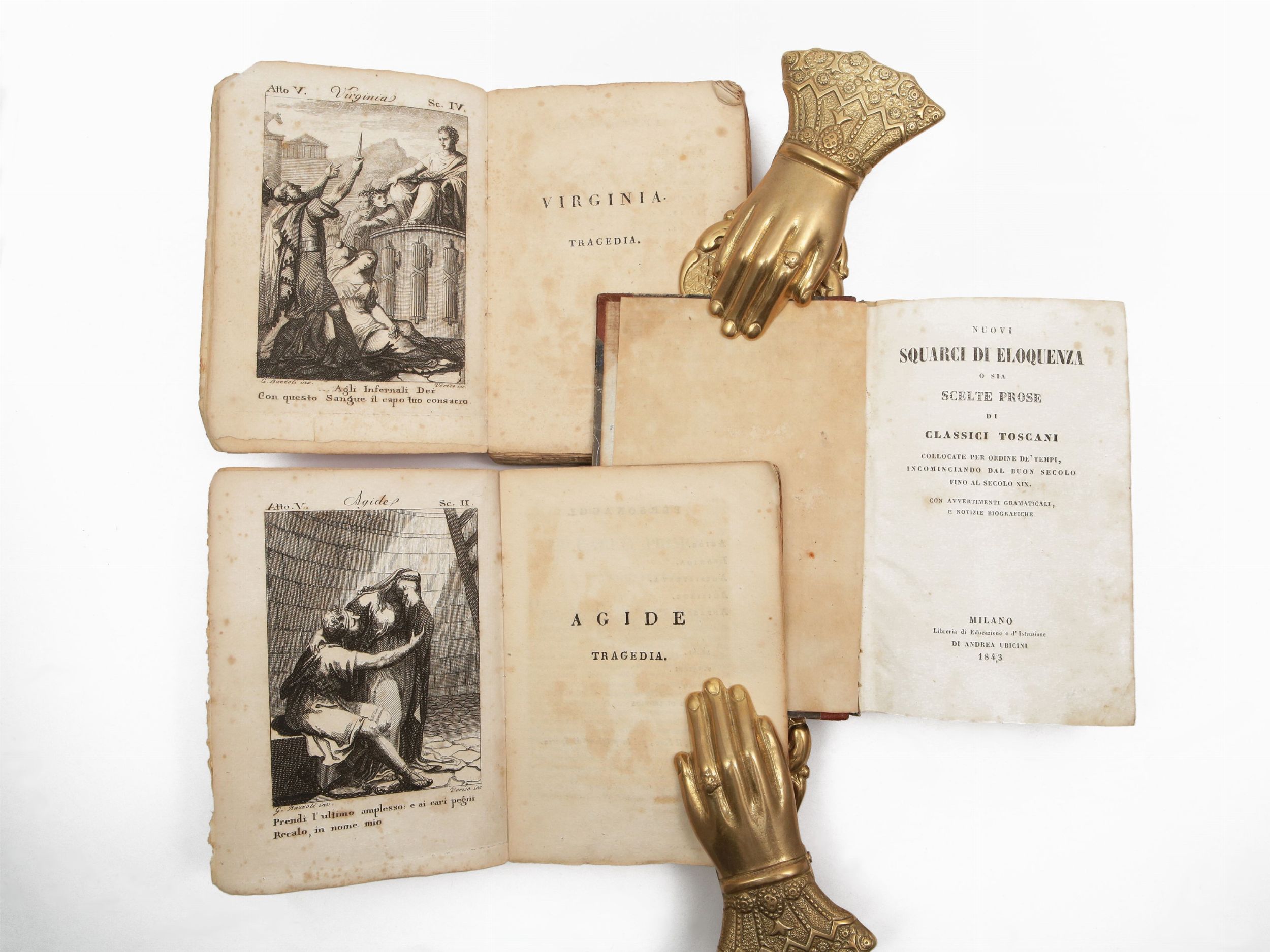 -Tragedie di Vittorio Alfieri da Asti, Firenze: presso Giuseppe Vigiani. A spese di Angiolo Garinei librajo, 1814, voll. 2 e 5 (di 6). In-8° (145x100 mm). Vol. 2: 74, 67, 79, 72, [2] p., 5 c. di tav. Contiene: Virginia, Agamennone, Oreste, Rosmunda - Vol. 5: 73, 53, 70, 66, [2] p., 5 c. di tav. Contiene: Agide, Sofonisba, Bruto Primo, Mirra. Belle antiporta figurate, incise in rame da Perico su disegno di Colignon. Tavole incise in rame da Perico su disegno di Bozzoli, una per ogni tragedia.