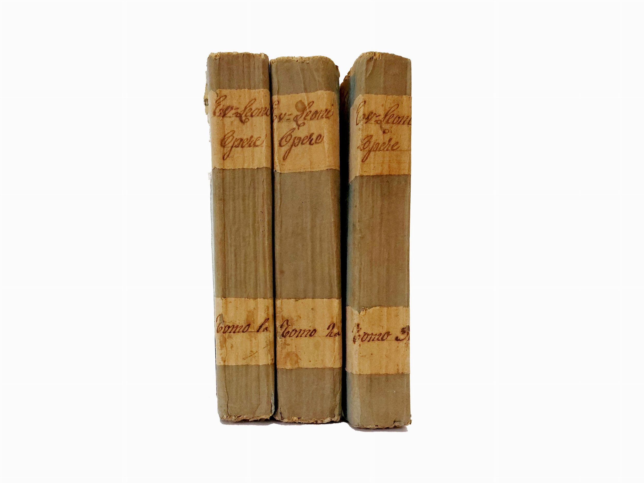 Milano: presso Pietro Agnelli in S. Margarita, 1818, 3 voll. (165x100 mm). Comprende: 1: Il Cantico dei Cantici tradotto e illustrato da Evasio leone (217, [3] p.) - 2: Elogi sacri forniti di annotazioni di Evasio Leone (262, [2] p.) - 3: I treni del profeta Geremia tradotti ed illustrati da Evasio Leone (258, 2 p.). Vecchie legature cartonate molto rovinate con cartigli recanti titoli calligrafici ai dorsi. Difetti (ingiallimenti, fioriture, becche, piccole mende (3)