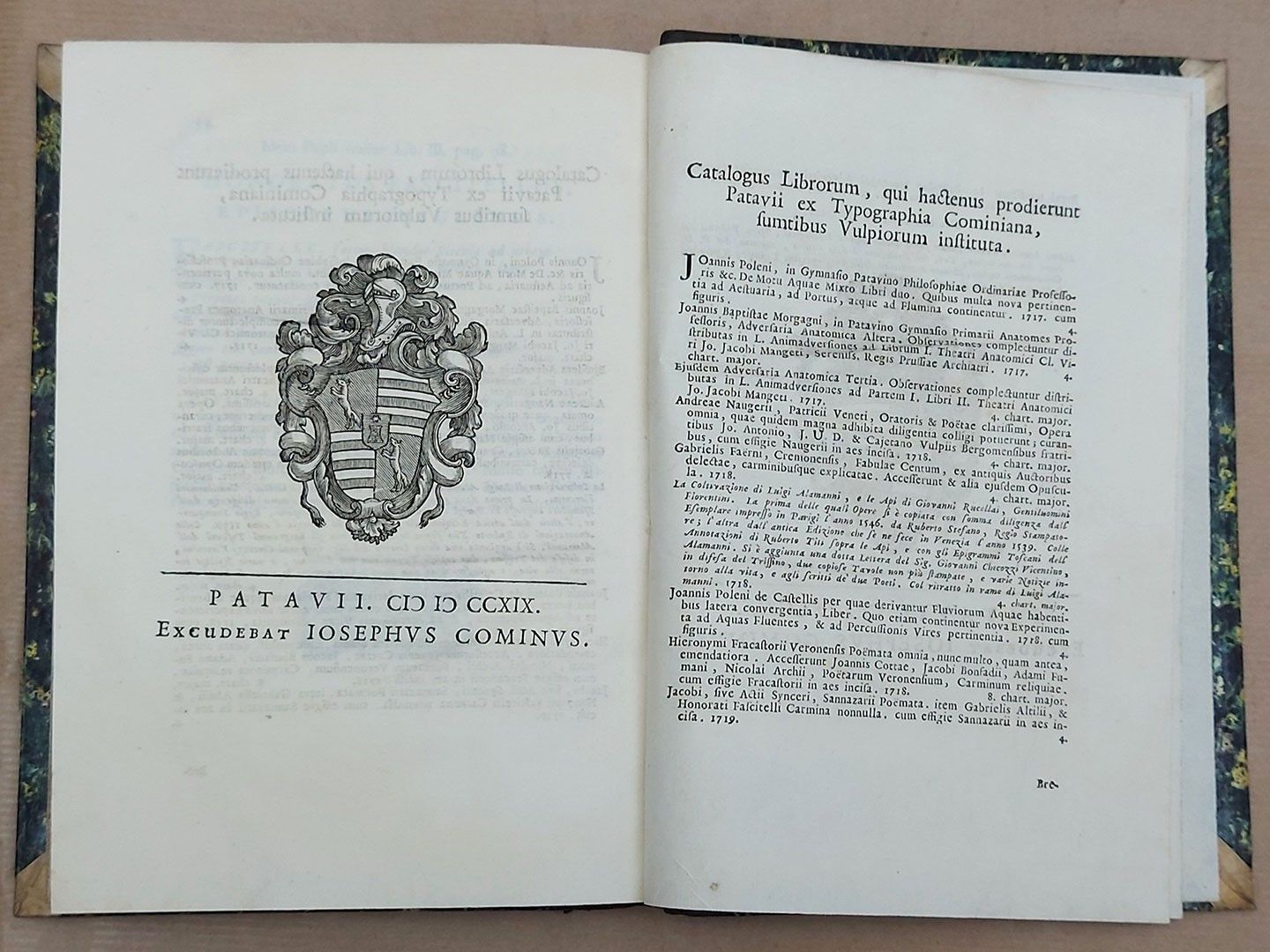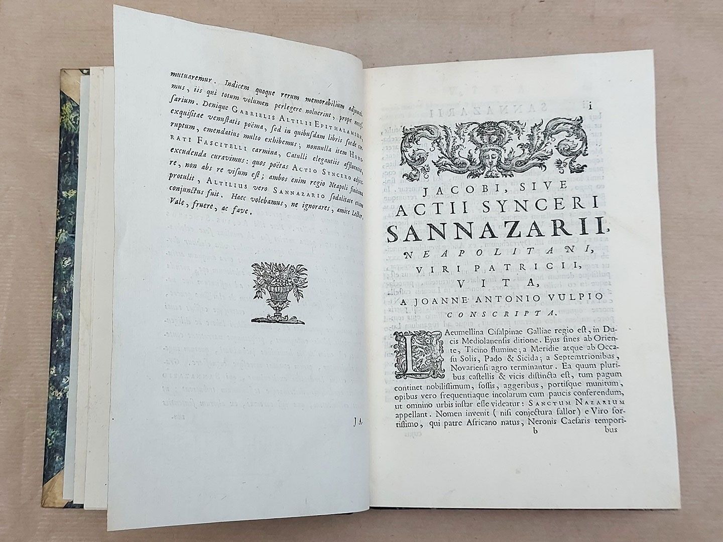 Patavii, Excudebat Iosephus Cominus, 1719 Jacobi, sive actii synceri Sannazarii, neapolitani, viri patricii, poemata ex antiquis editionibus accuratissime descripta. Accessit ejusdem Vita, Jo. Antonio Vulpio auctore, item Gabrielis Altilii, et Honorati Fascitelli carmina nonnulla. In-4° (240x170 mm). Legatura in mz. pelle verde con dorso a quattro nervi, fregi e titoli in oro, piatti marmorizzati. Pagine [8], LII, 248; 54 [i.e. 52], [4], 1 tav. Omesse le p. 50-51 della seconda serie numerica. Ritratto calcografico dell'A. all'antiporta (ex musaeo Paullii Jovii). Vignetta calcografica cominiana al frontespizio. Iniziali e fregi xilografici. Colophon con stemma Volpi-Cominiano a p. 248 con data 1718 e nuovamente a carta G3v con data 1719. Contiene: De partu virginis libri tres e Epigrammaton di Jacopo Sannazaro; Epithalamium in nuptias Joannis Galeatii Sfortiae, ducis Mediolanensis, & Isabellae Aragoniae, Alfonsi II. Regis Neapolitani, filiae di Gabriele Altilio; Carmina elegantissima di Onorato Fascitelli; Catalogus librorum, qui hactenus prodierunt Patavii ex typographia Cominiana sumtibus Vulpiorum instituta a cura dell'editore