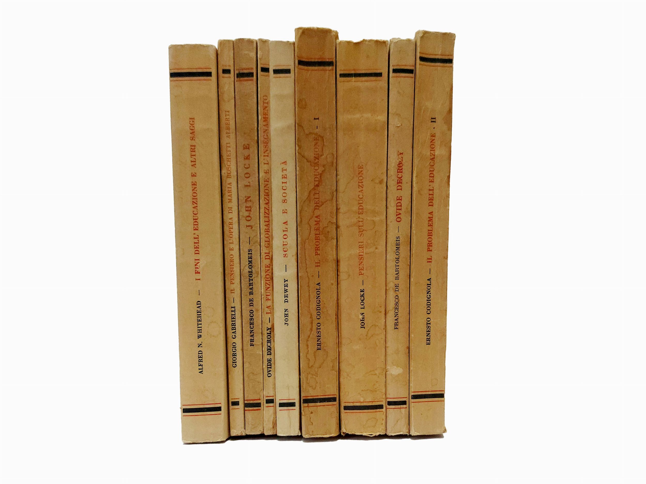 anni Cinquanta contiene: F. De Bartolomeis, Ovide Decroly - F. De Bartolomeis, John Locke - G. Gabrielli, Il pensiero e l'opera di Maria Boschetti Alberti - O. Decroly, La funzione di globalizzazione e l'insegnamento - J. Dewey, Scuola e Società - E: Codignola, Il problema dell'educazione, 2 voll. - A. N. Whitehead, I fini dell'educazione e agli saggi - J. Locke, Pensieri sull'educazione. Difetti, fioriture (9)