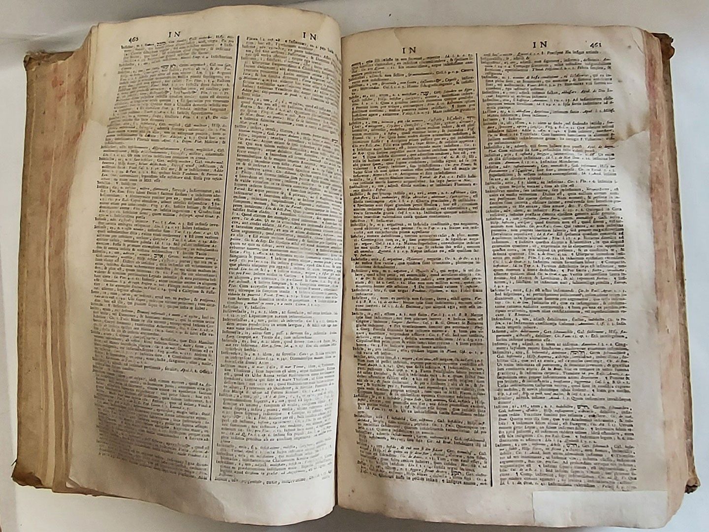 Patavii, Typographia Seminarii, 1718 Hoc est lexicon latinum, variarum linguarum interpretatione adjecta. Editio postrema de quae vide praesationem. In folio (345x225 mm) 2 tomi rilegati in 1 vol. con paginazione continua: [10], 795, 797-1128, 52, 116 p. Legatura in piena pergamena, con macchie ai piatti e mende alle punte, 5 nervi, titolo calligrafico al dorso, tagli spruzzati. Bruniture, gore di umidità, macchie e fioriture sparse. Alcune c. restaurate, ultime 2 c. con ampie mende con perdita di testo