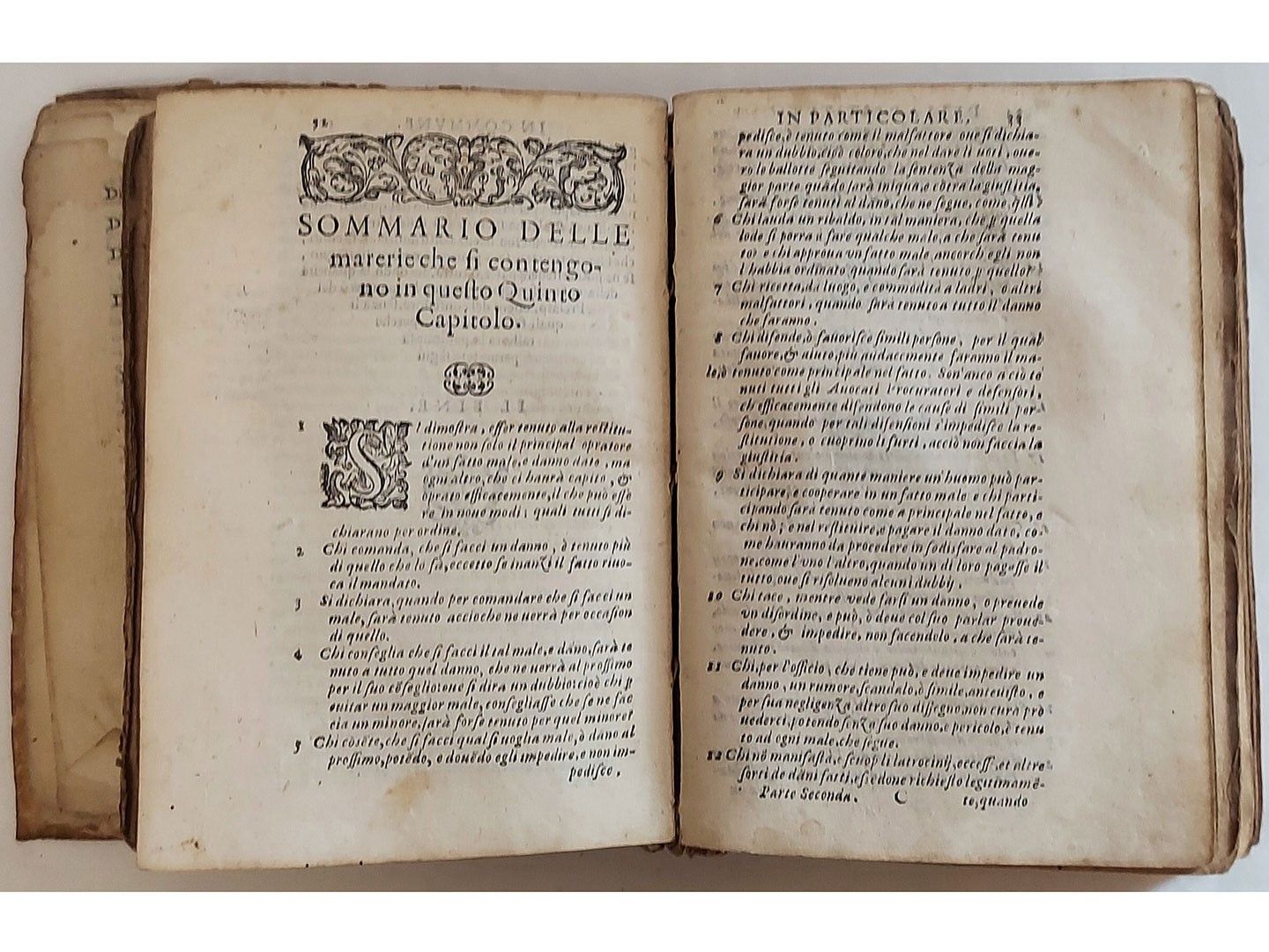 Venezia, Somasci, 1591 dei confessori del R. Don Mauro Antonio Berardino di Bisceglia dottore e maestro di theologia, dove si tratta d'ogni sorte de restitutione, usure & cambi [...] Prima [-terza] parte. (150x110 mm). 3 parti in 1 vol. ciascuna con proprio frontespizio: [16] c., 400, [1 c. bianca], [12] c., 391 p., [15] c., [1 c. bianca], 362 p. Legatura in piena pergamena con titolo calligrafico al dorso, fortemente danneggiata, con mende, fori di tarlo e staccata alle cerniere; pagine iniziali staccate, con bruniture sparse e macchie di umidità. Iniziali e fregi xilografici