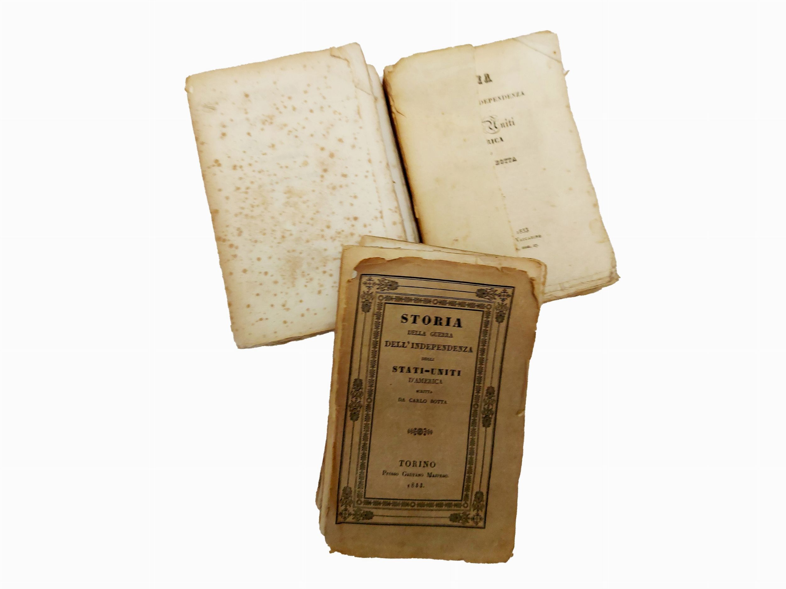 - Storia della guerra dell'indipendenza degli Stati Uniti d'America scritta da Carlo Botta, Torino: presso Giuseppe Vaccarino, 1833, voll. III (387 p.) e V (306 p.). Legature editoriale con evidenti difetti (piatti staccati o mancanti, parzialmente slegati). Fioriture.