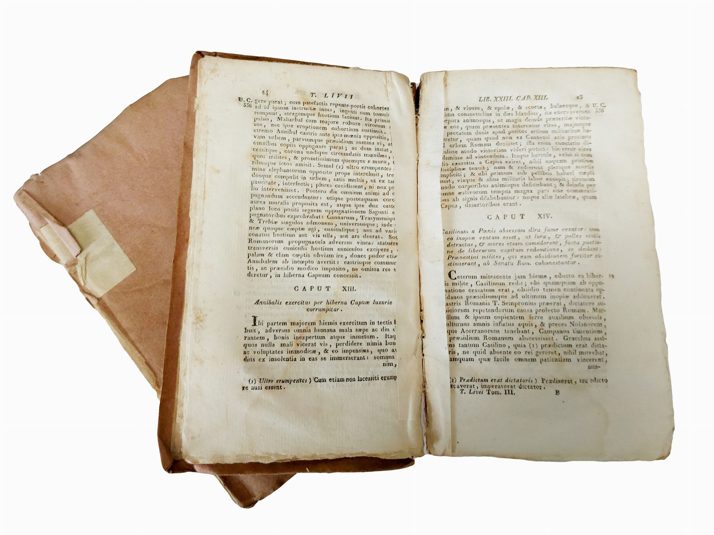 et selectis adnotationibus illustrata ab J.B.L. Crevier cum ejusdem supplementis in postremos libros ex recensione Arn. Drakenborkii, Bassani: suis typis Remondini edidit, 1821, 6 voll. (180x100 mm). XXXV, 357 p.; 424 p.; 491 p.; 441, 388 p.; 285 p. Si aggiunge il vol. 7: Exercitationes rhetoricae in orationes T. Livii quibus accedunt Joannis Clerici integrae adnotationes, ... nuper in bibliotheca vaticana repertum, & scholiis illustratum a Vito M. Giovenazzo, 478 p. Legature cartonate con titoli su cartigli calligrafici ai dorsi. Difetti: strappetti, minime gore d'acqua, fioriture, cerniere allentate (7)