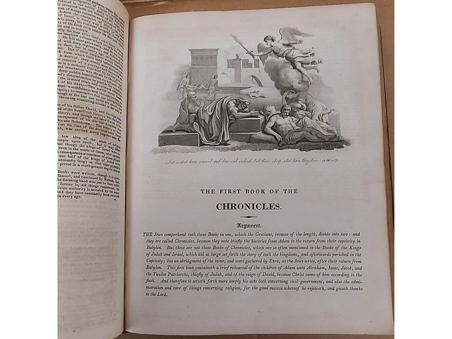 London, Printed by C. Baldwin, 1810 containing the Old and New Testaments [...] as printed bu Royal Authority at the time of the Reformation. (270x220 mm) 2 tav. f.t. e ill. n.t. all'inizio di ogni Libro. Legatura muta in pelle, usurata, in tela al dorso. Cerniere allentate. Bruniture e fioriture diffuse