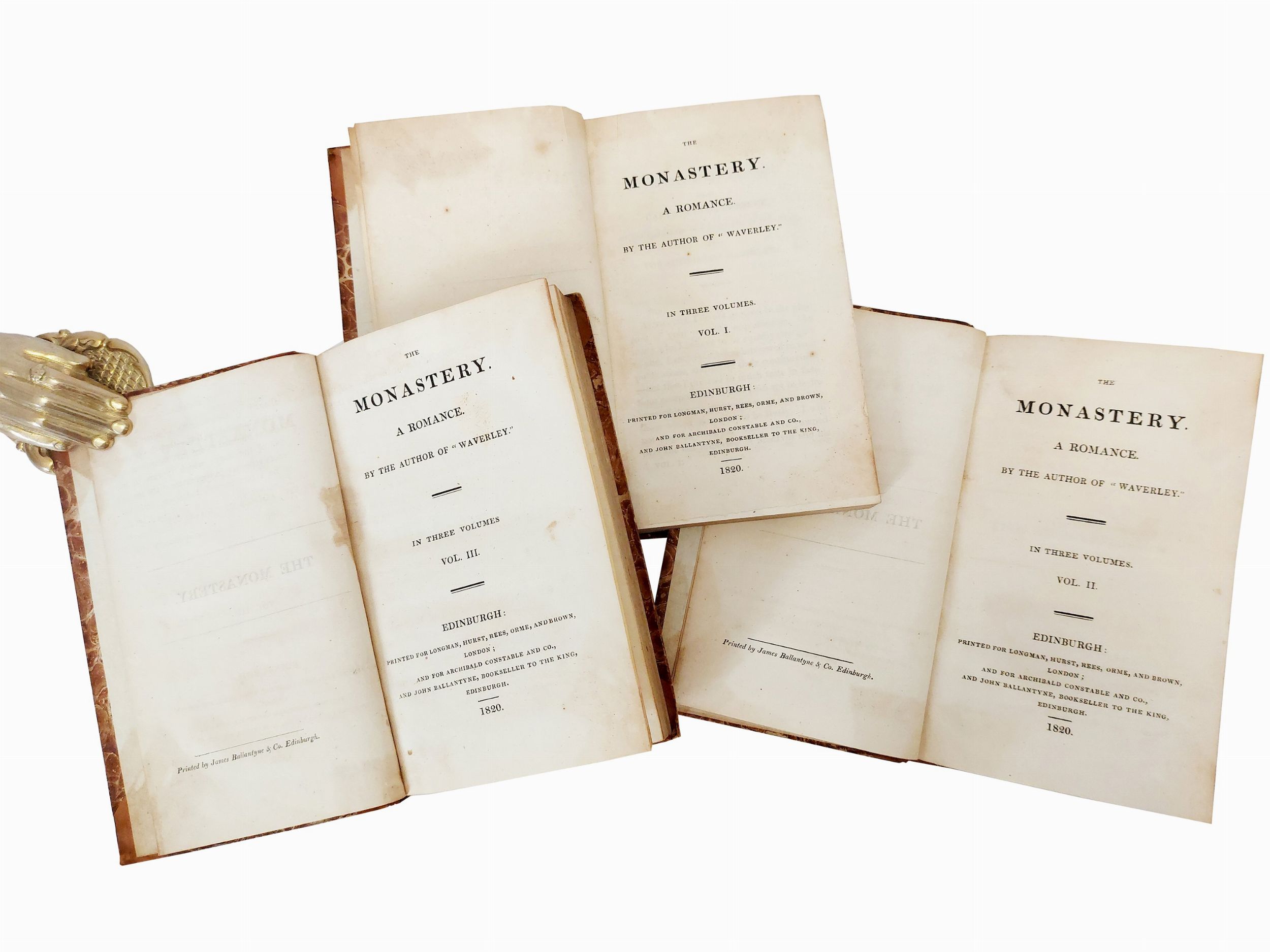 Edinburgh: Printed for Longman, Hurst, Rees, Orme, and Brown, London; And for Archibald Constable and Co. And John Ballantyne, Bookseller to the King, Edinburgh, 1820, 3 voll. (180x110 mm). 331 p.; 333 p.; 351 p. Legature in mz. pelle con angoli, titolo in nero e fregi dorati al dorso; lievi difetti alle cuffie, rare fioriture, macchie alle c. di guardia. Prima edizione (3)