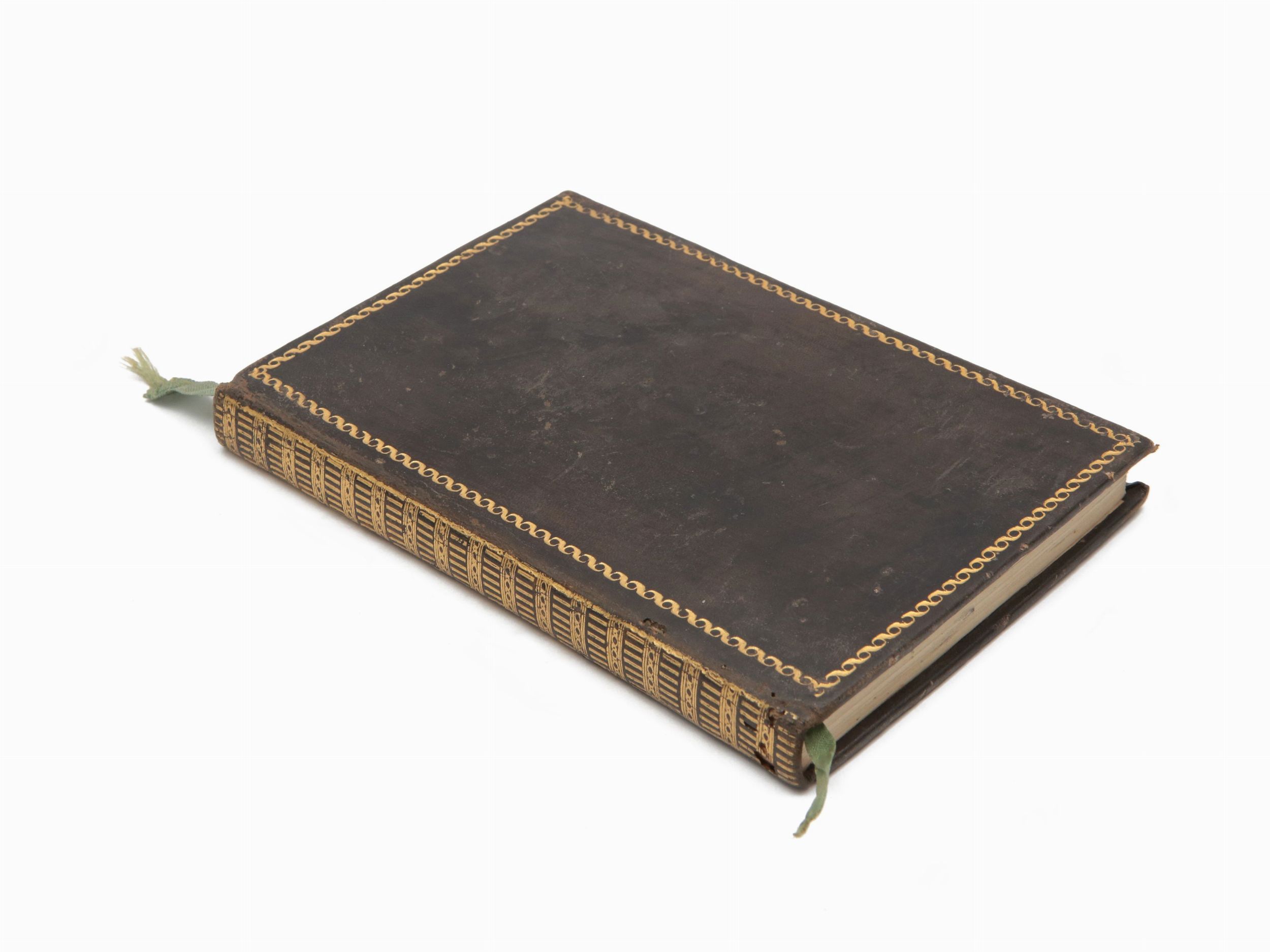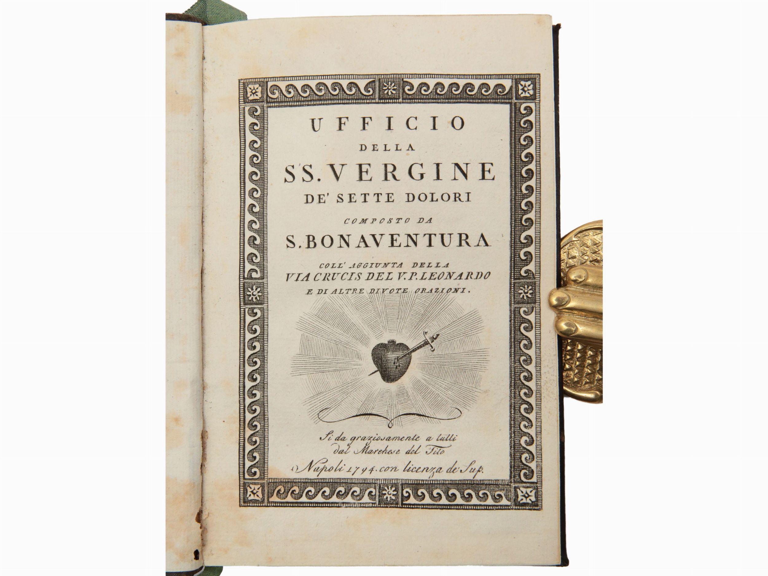 Napoli, Si da graziosamente a tutti dal Marchese del Tito, 1794. In-8° (175x110 mm). 128 p., 24 tav. ...coll'aggiunta della Via Crucis del V P. Leonardo e di altre divote orazioni. Bel frontespizio inciso con cornice architettonica e cuore trafitto. Fregi, finalini; completo delle 24 tavole. Legatura in piena pelle muta, con cornice dorata ai piatti e ricchi fregi dorati al dorso; lievi difetti. Interno fresco, presente solo qualche macchia alle c. iniziali e finali e una minima mancanza marginale a p. 67