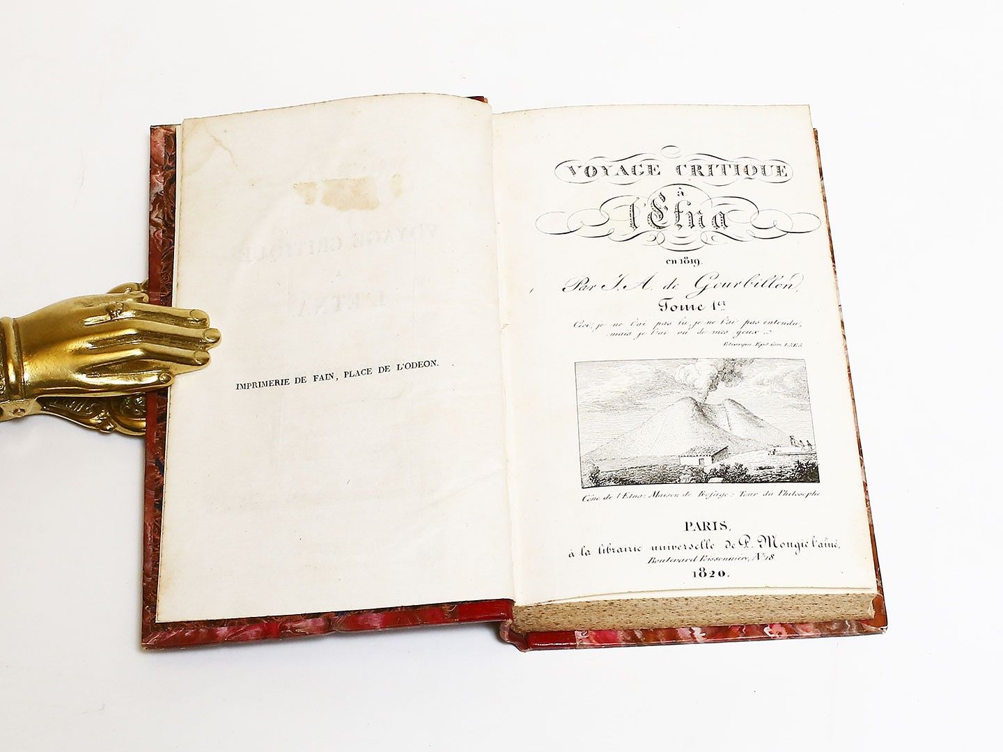 Paris: à la librairie universelle de P. Mongie l'ainé, 1820, 2 voll. In-8° (205x125 mm) [6], 541 p., 2 c. di tav.; 463 p., 1 c. di tav. Frontespizi calcografici con vignetta con veduta dell'Etna. Legatura in mz. pelle con titoli in oro ai dorsi, minimi difetti. Tagli spruzzati. Fioriture sparse. Gora alle pp. iniziali del secondo volume Edizione originale con 3 tavole in totale, probabile mancanza di 1 o 2 tavole (2)