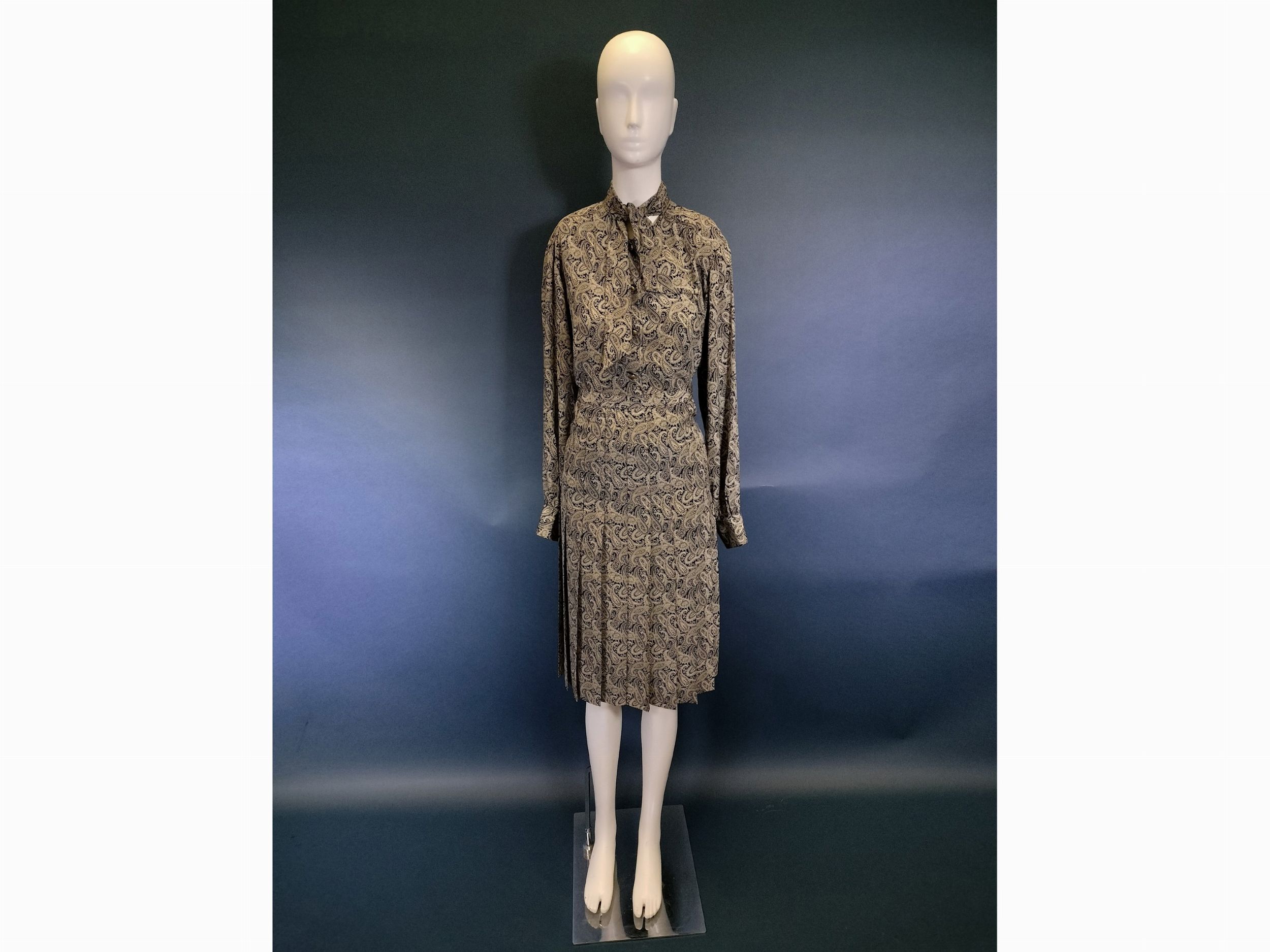 estivo con motivi damascati sul blu e grigio, sciarpina a fiocco sul collo e gonna plissé