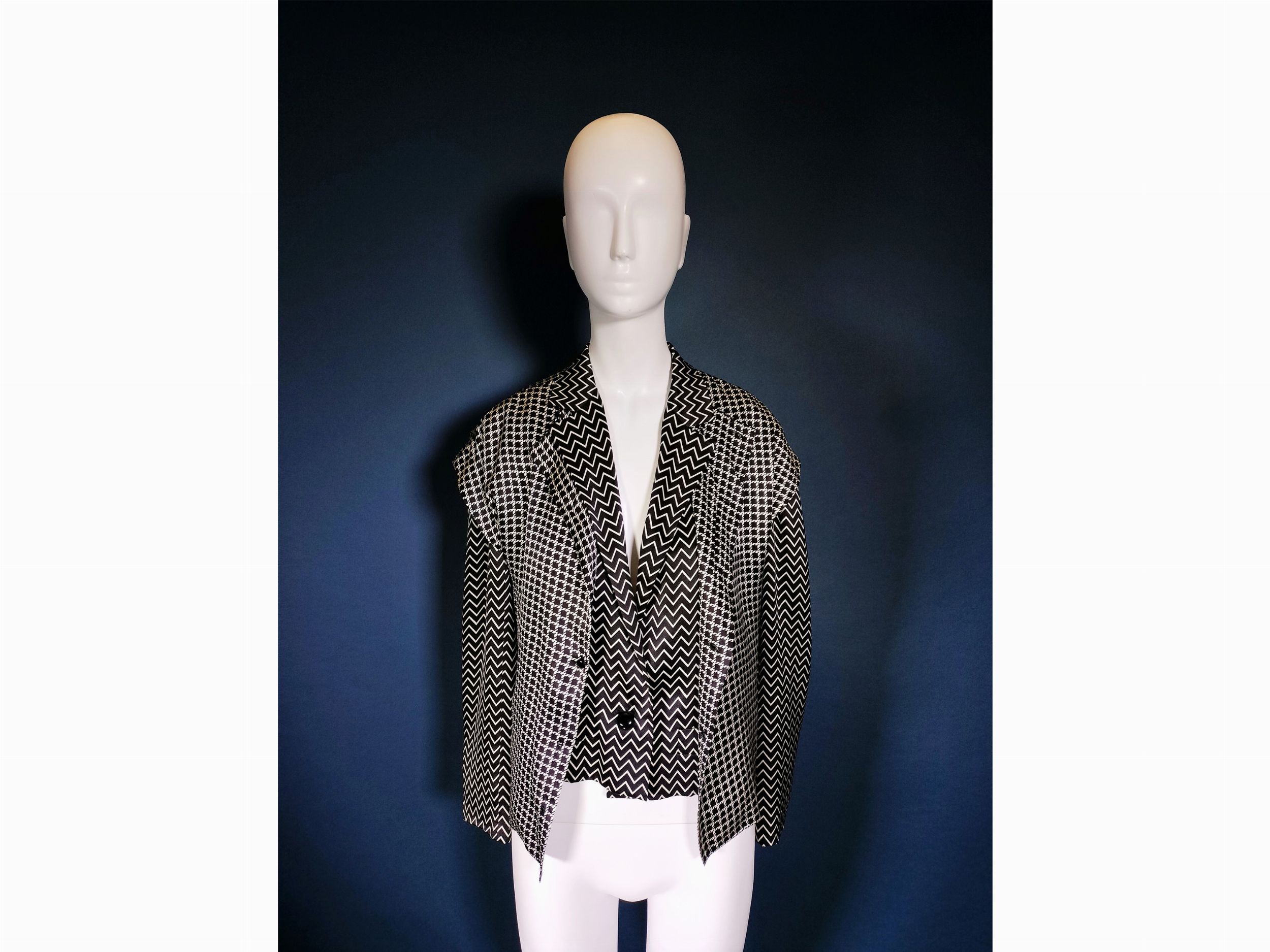 Estate 1982 di una giacchina in seta con taschino, motivo a zig zag nero e bianco, abbinato ad un gilet sempre in seta firmato Christian Dior