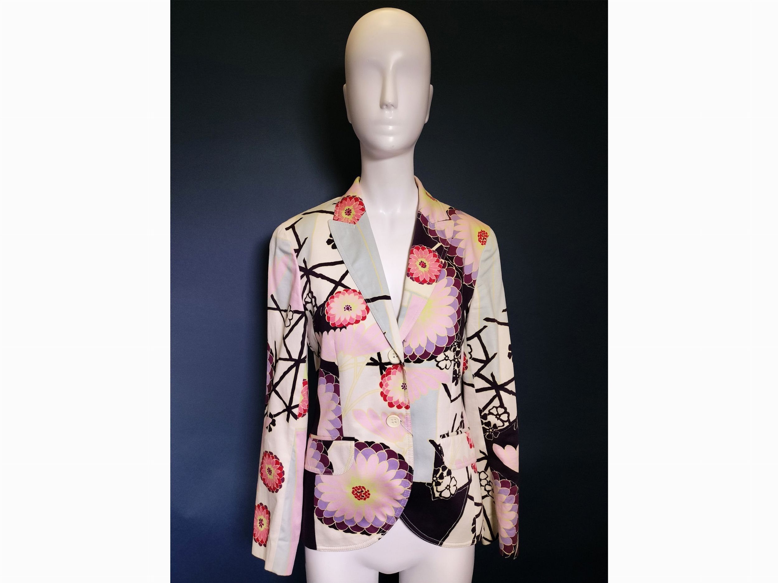 Anni Novanta con fantasia di fiori e rami sui toni del rosa e del viola, pantalone a zampa