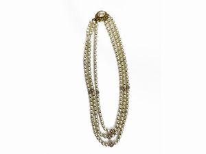 L 59 cm in perle barocche simulate, strass e metallo dorato