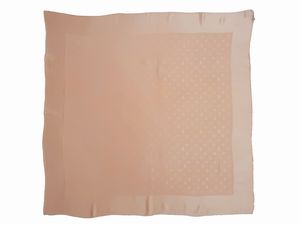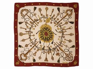 cm 90x88 1965 stampa con chiavi d'oro e nappe verdi, motivo centrale su fondo bianco con cornice bordeaux a borchie [..]