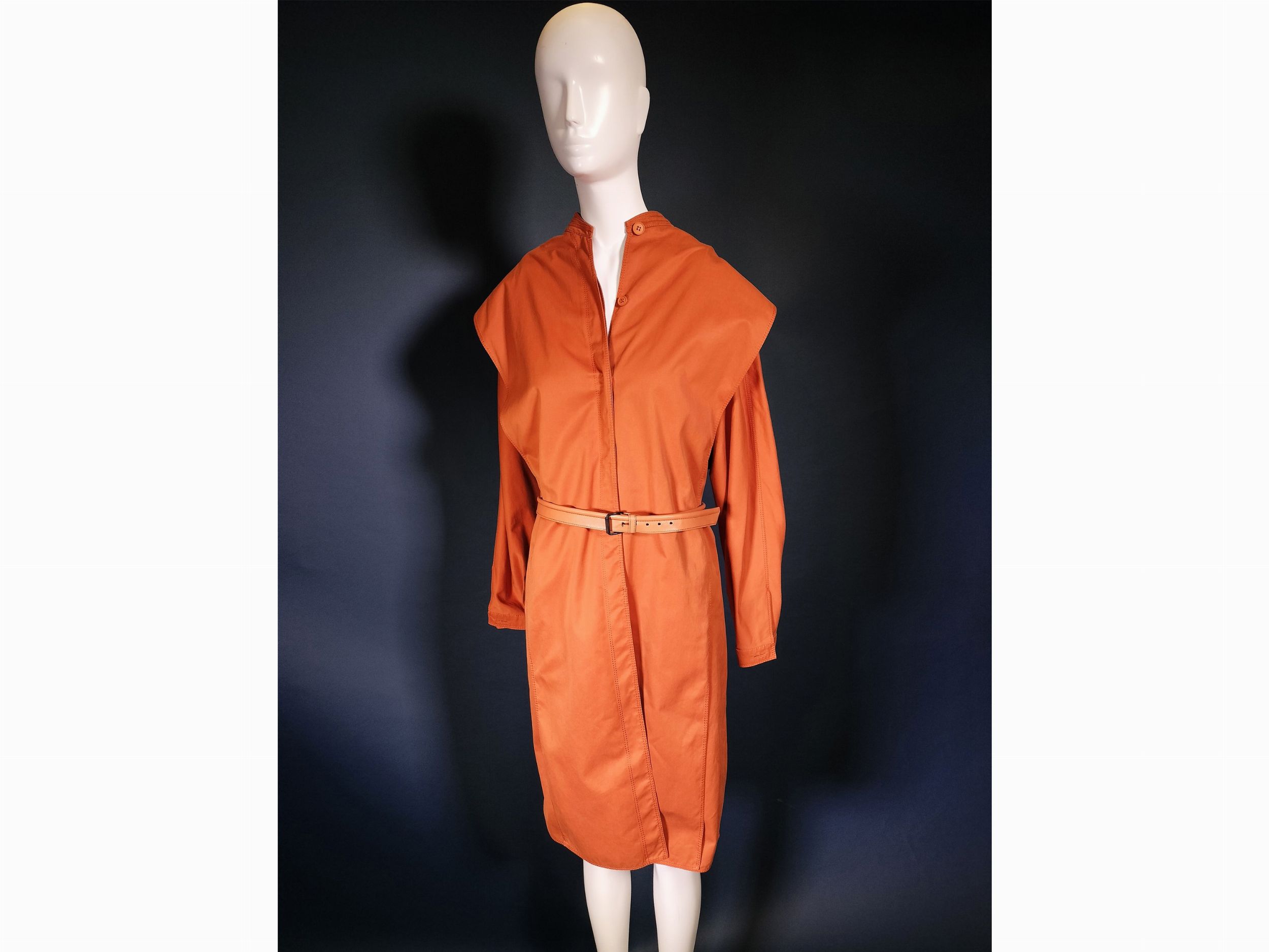 Anni Novanta contenente una giacca color miele in cotone, una maglia bianca a righe marroni e un abitino modello trench in tessuto arancione con cintura in pelle