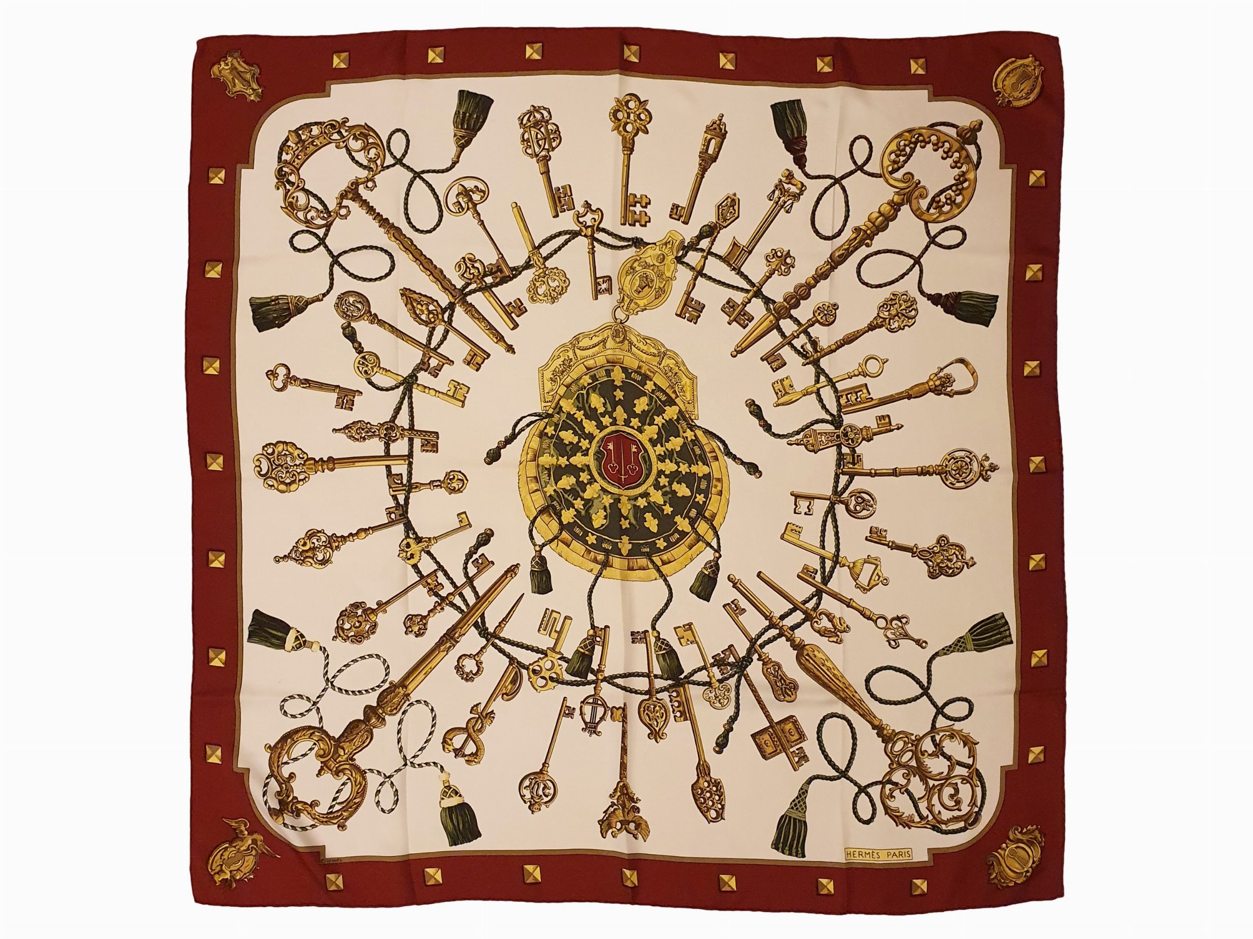 1965 stampa con chiavi d'oro e nappe verdi, motivo centrale su fondo bianco con cornice bordeaux a borchie dorate
