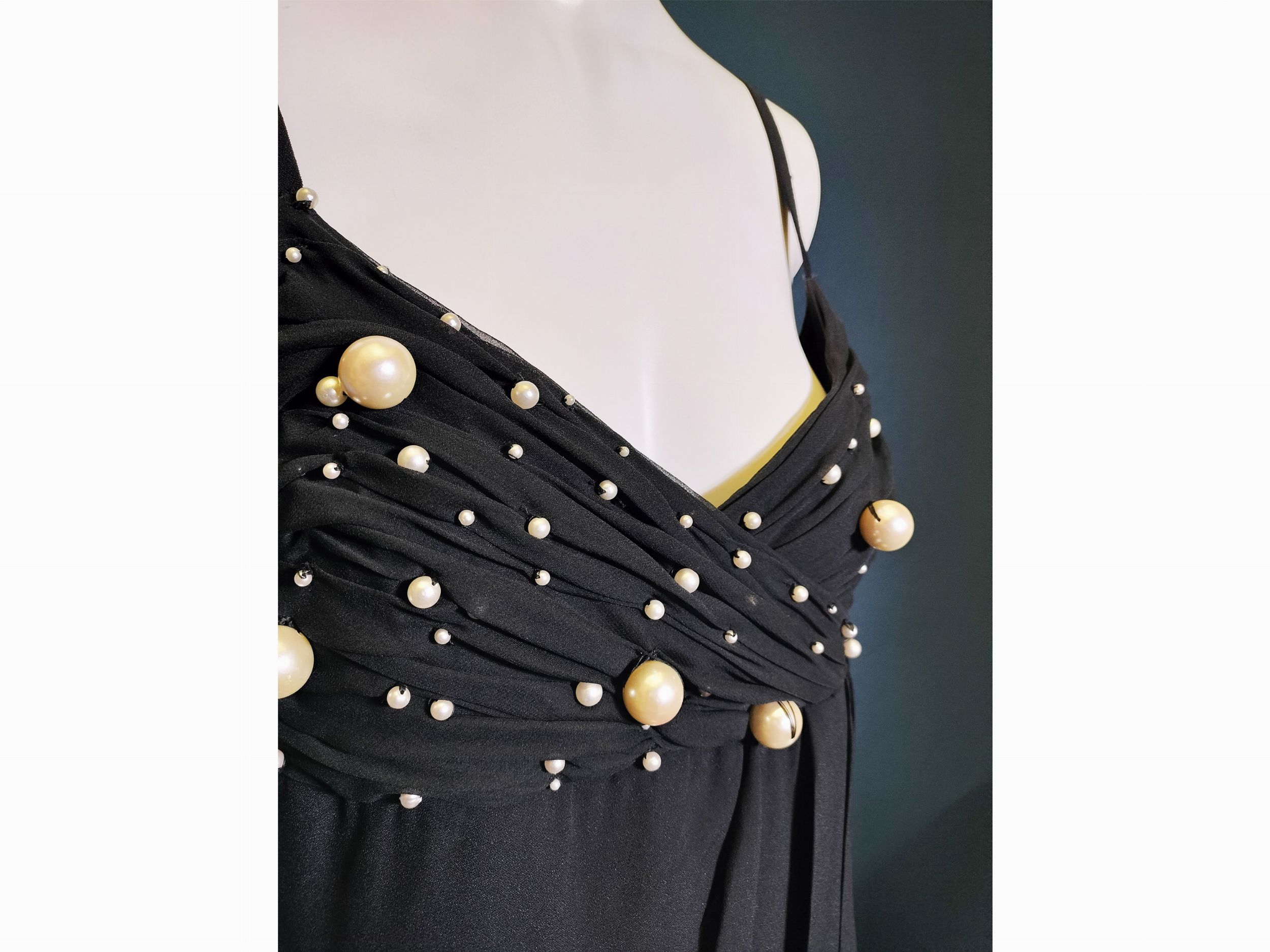 un abito Furstemberg Couture, corpetto con perle di varie dimensioni, un sandalo blu con zeppa in corda ed una borsa in pelle Salvatore Ferragamo, un tailleur Genny con pantalone in velluto e una gonna Yves Saint Laurent blu