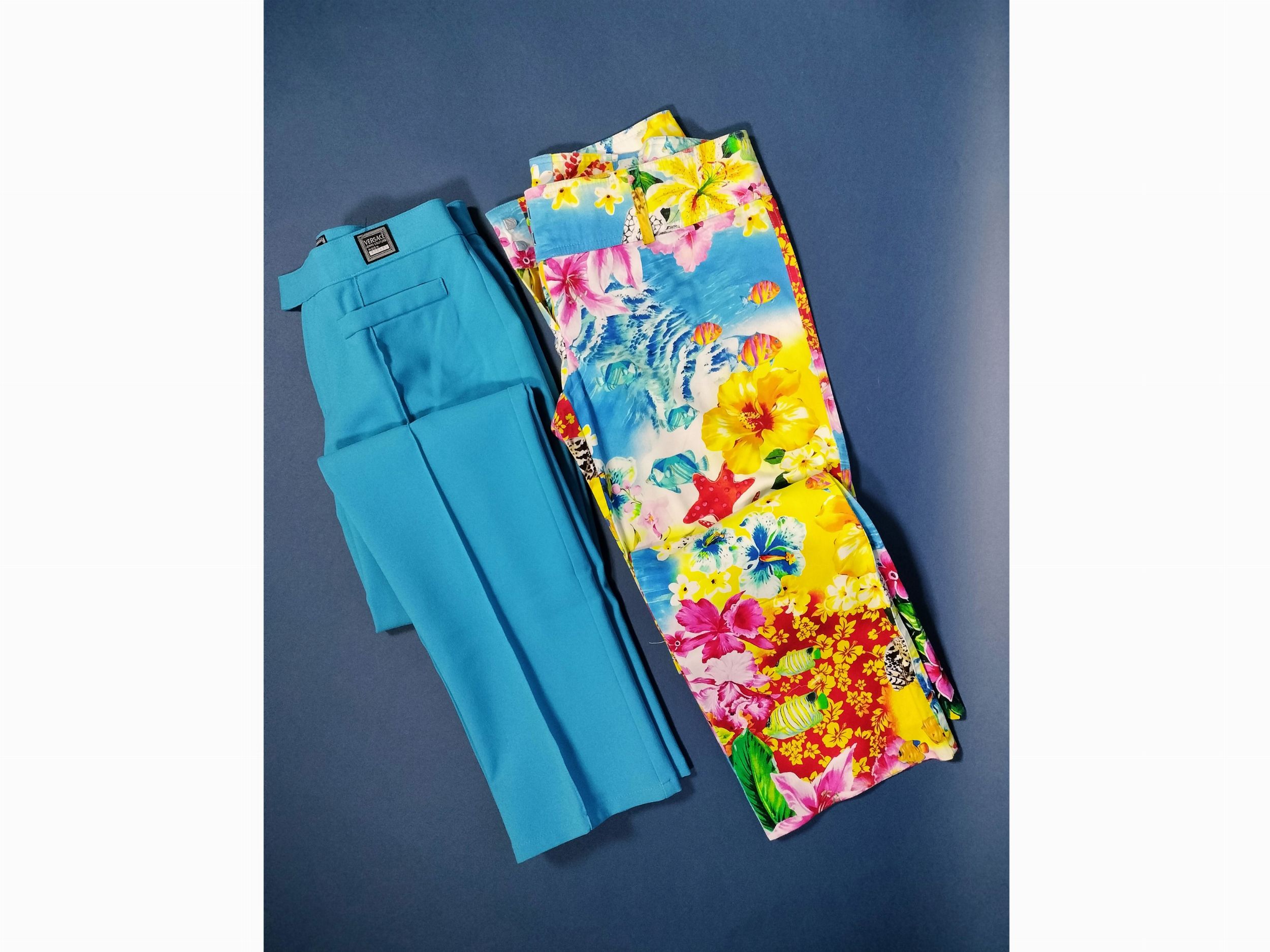 un completo Escada con fantasia di fiori composto da un jeans una canottiera ed un foulard ed un pantalone Versace Jeans Couture azzurro