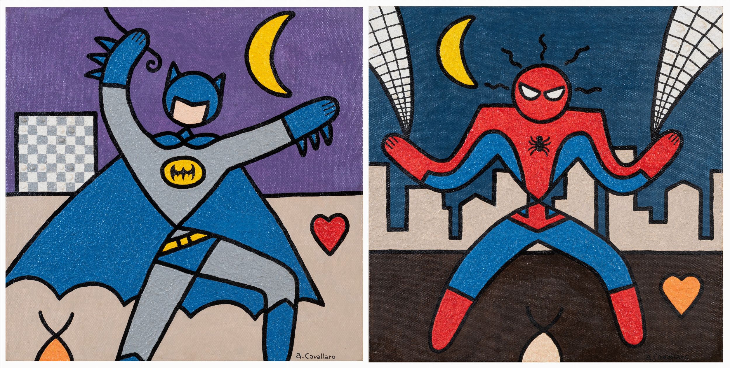 lotto di 2 acrilici e smalti su tela, cm. 40x40 cad.