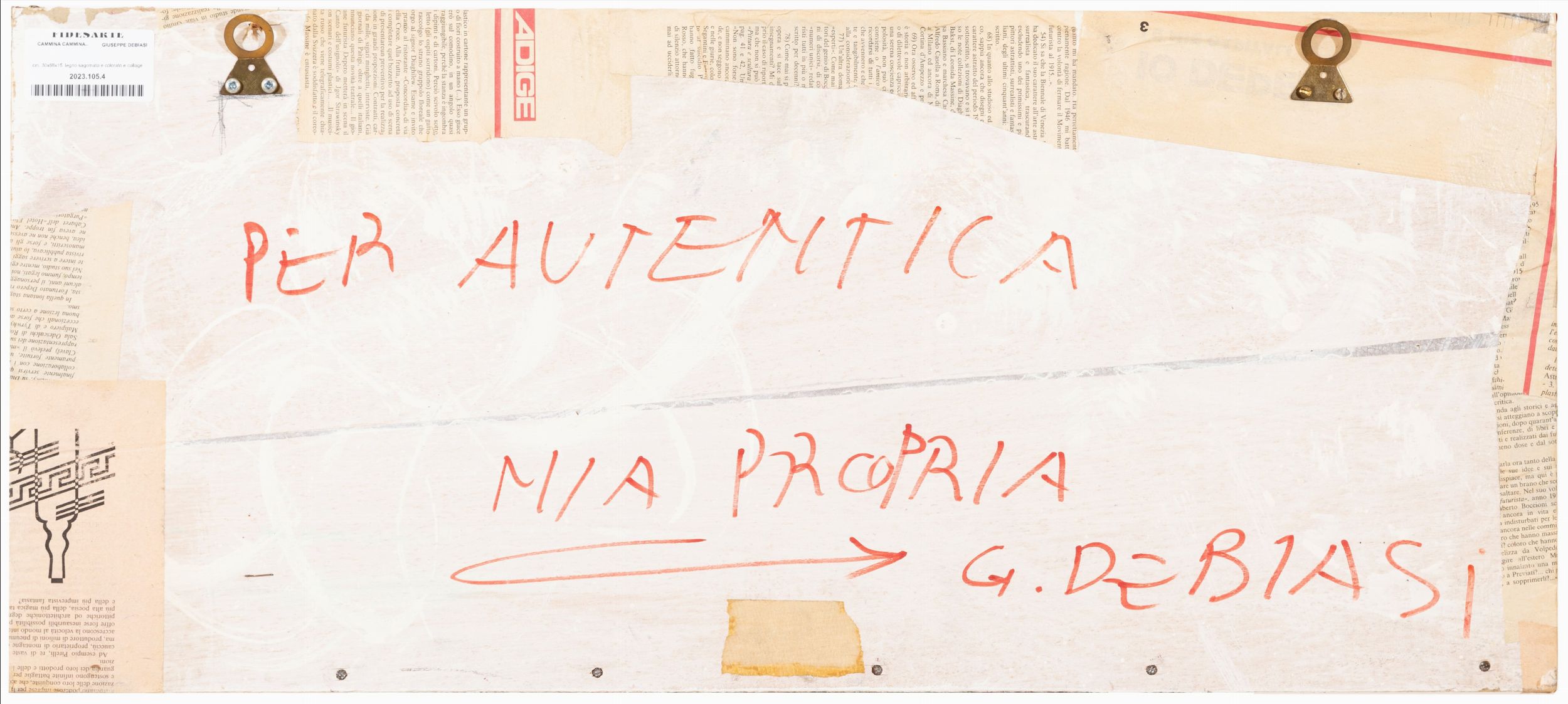 legno sagomato e colorato e collage, cm. 30x68x15