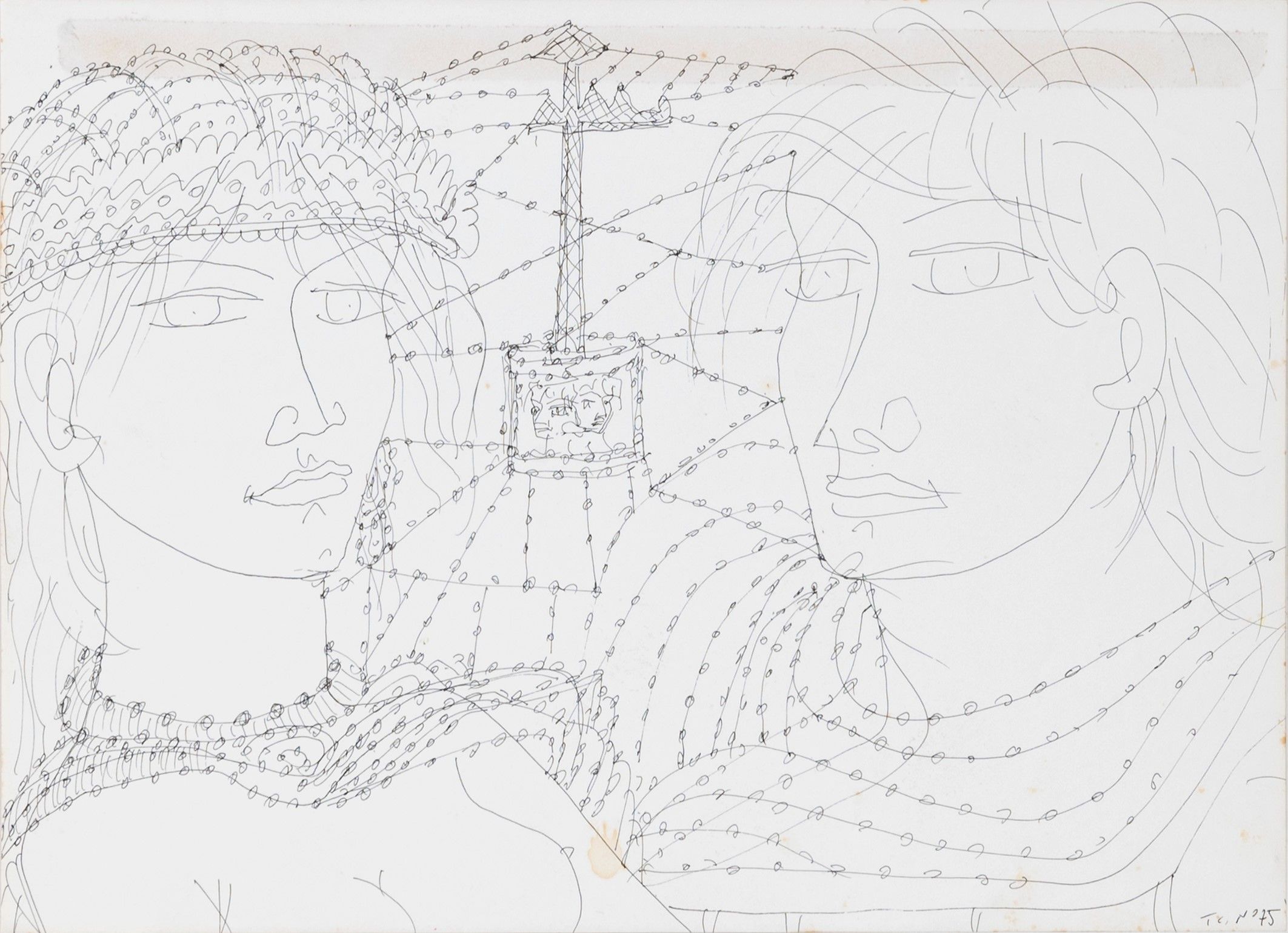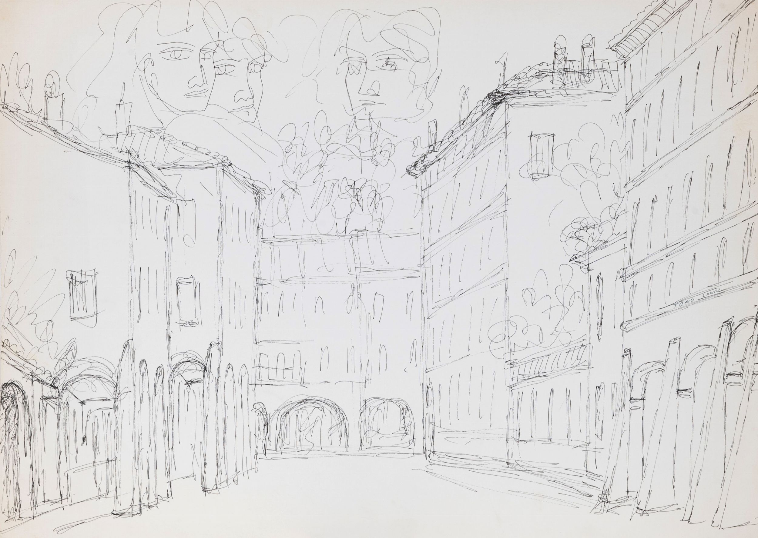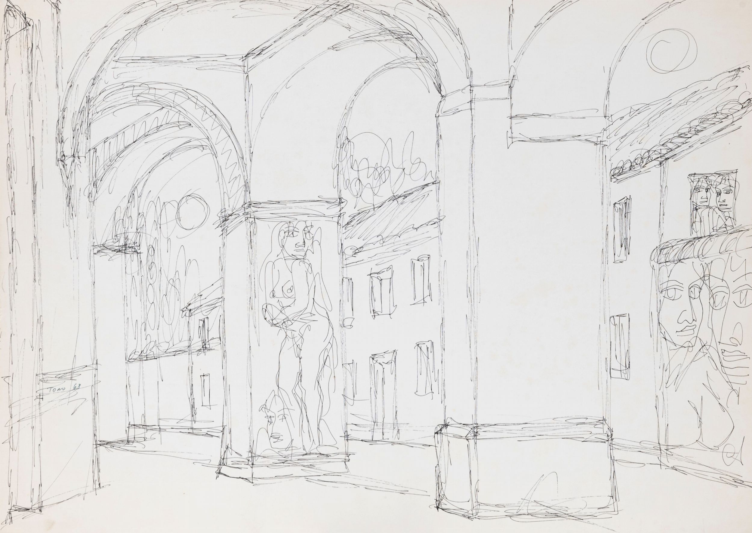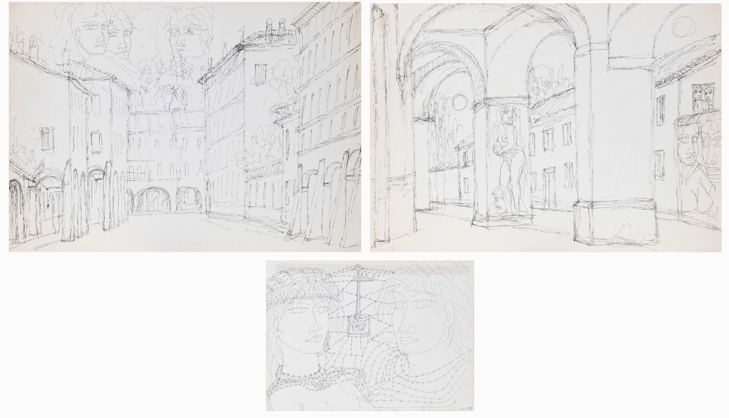 lotto di 3 disegni a china su carta, cm. 35x50 e 21x30