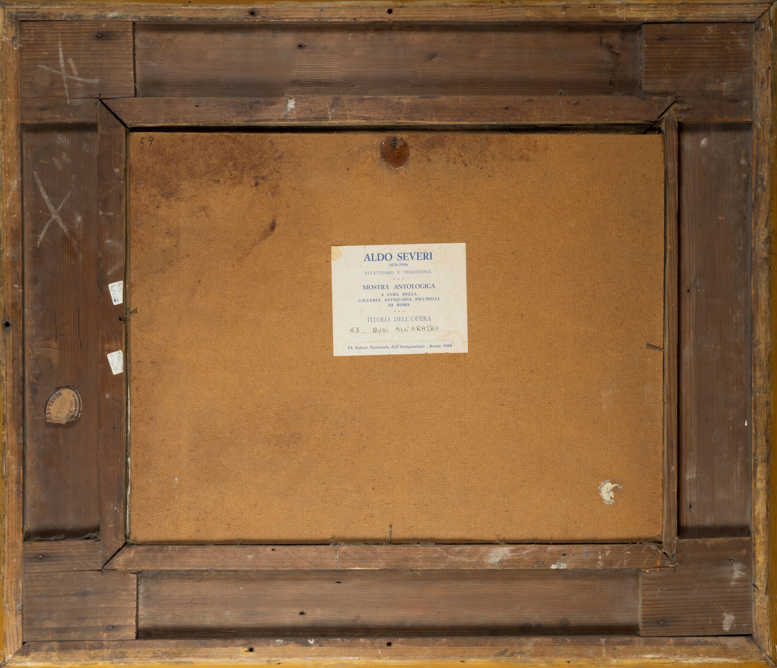 Sul retro, etichetta della mostra antologica del pittore a cura della Galleria Antiquaria Piccirilli di Roma nel IX Salone Nazionale dell'Antiquariato tenutosi a Roma nel 1984 con titolo e numero di riferimento dell'opera (63).