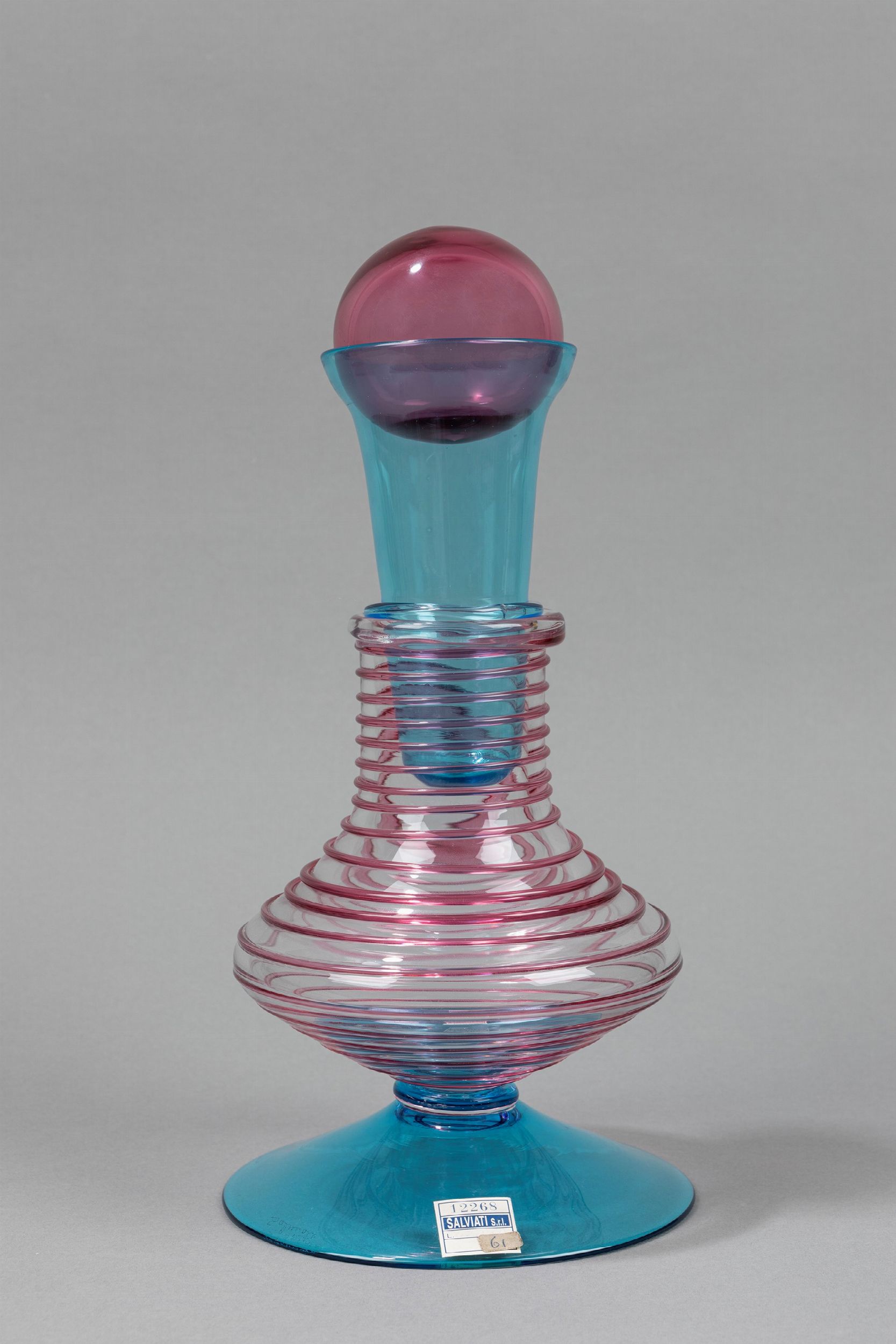 1985 ca. Con tappo e con il suo bicchiere nei colori del rosa e dell’azzurro. Vetro soffiato di Murano.