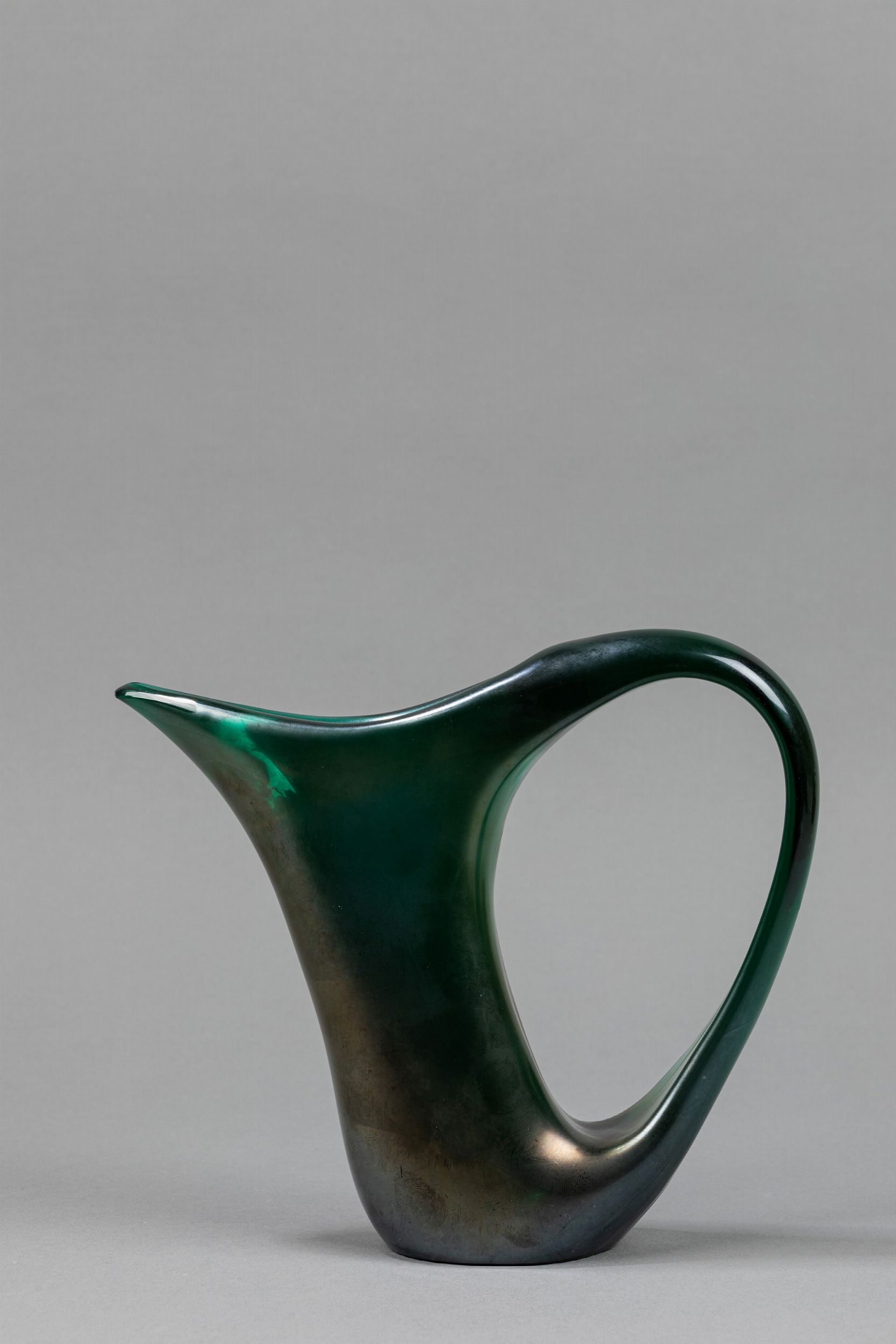 1950 ca. della serie Anse volanti in vetro verde iridato con lungo becco e grande ansa ricavata forando la parete stessa del vaso.