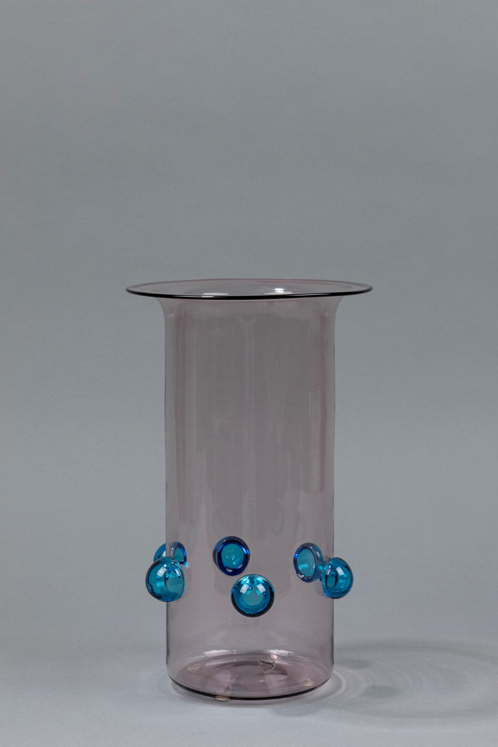 1960 ca. Cilindrico in vetro soffiato trasparente con bolle color acquamarina.