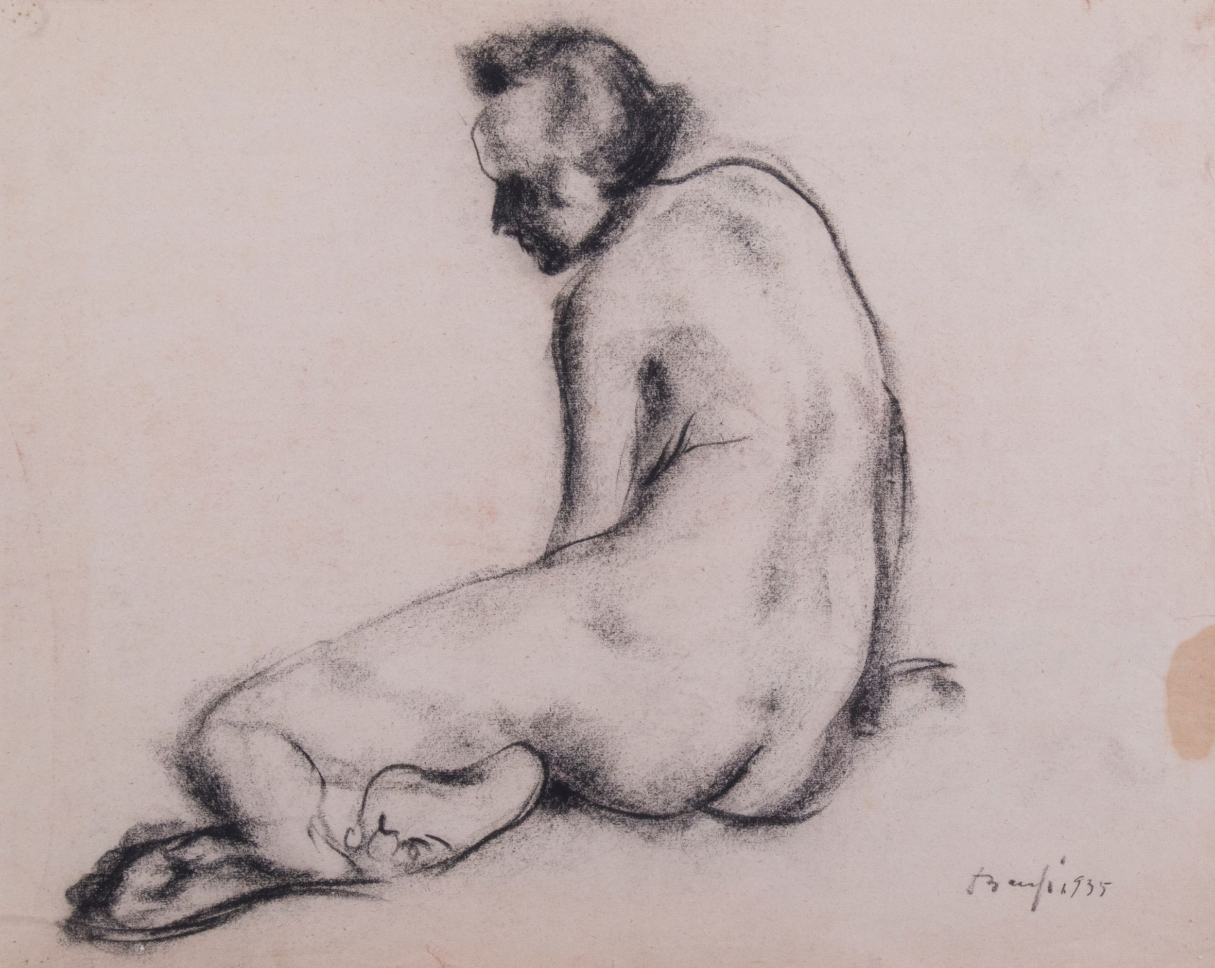 A) Nudo accovacciato, 1935, carboncino su carta, cm. 39x48,8. Firma e data in basso a destra: Bausi 1935;