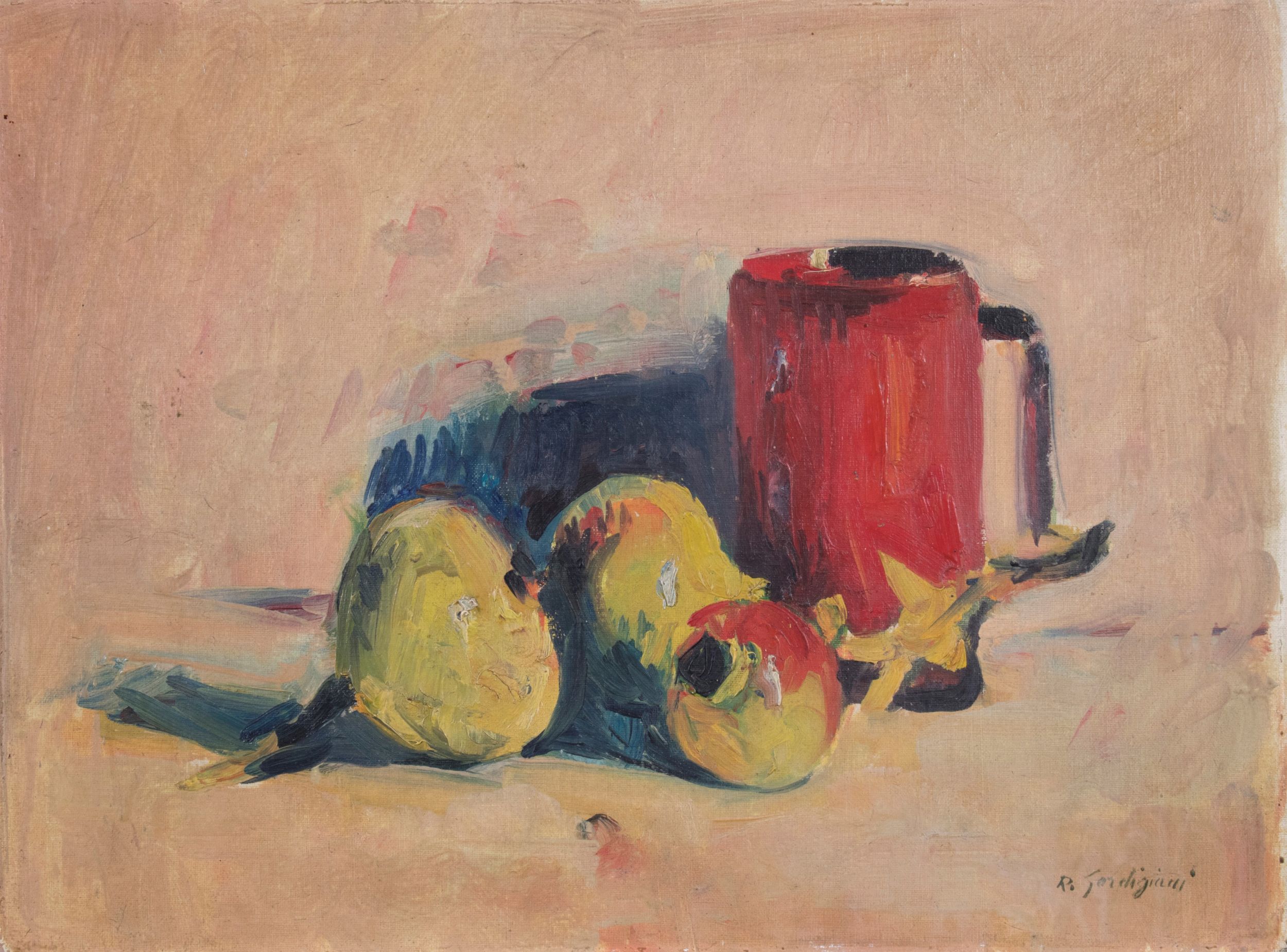 A) Melograne e vaso rosso, olio su cartone telato, cm. 29,5x39,5. Firma in basso a destra: R. Gordigiani; firma e titolo al verso: R. Gordigiani / Melograne e / vaso rosso; B) Natura morta, olio su cartone, cm. 31,5x37,5. Firma in basso a destra: R. Gordigiani.