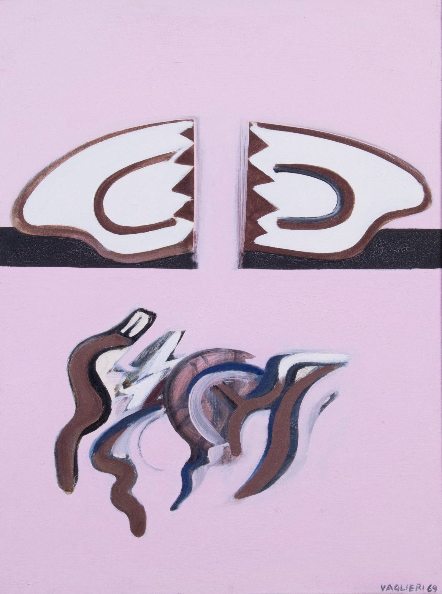 1969 Firma e data in basso a destra: Vaglieri 69; titolo, firma e data al verso sulla tela: Piatto rotto / Frammenti / Vaglieri / '69;