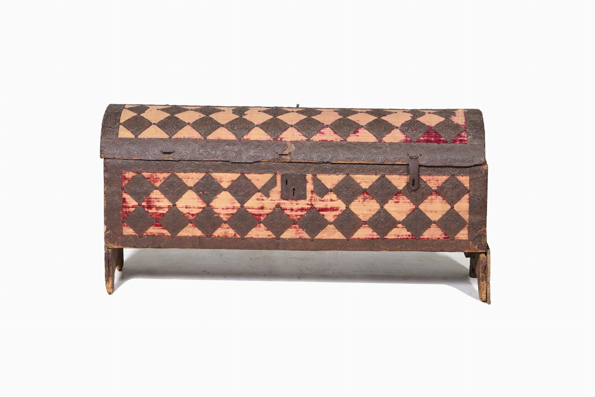 Antico baule in legno con rivestimento in lamierino sbalzato e tessuto. XVII sec [..]