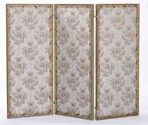 Paravento a tre ante in legno intagliato e laccato, ante rivestite in tessuto