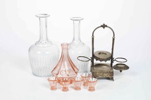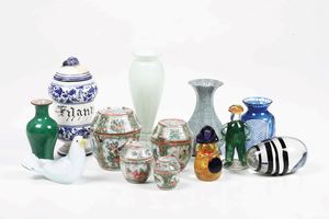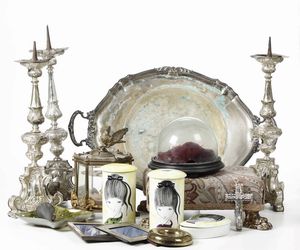 Vassoio in metallo, tre candelieri argentati, ceramiche e altro