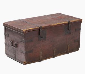 Antico baule in legno con rivestimento in lamierino sbalzato e tessuto. XVII sec [..]