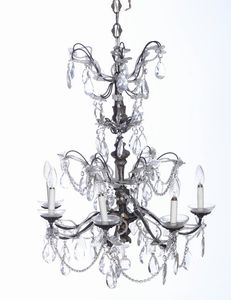 Lampadario a sei luci con struttura in metallo sbalzato e gocce in cristallo. XIX [..]