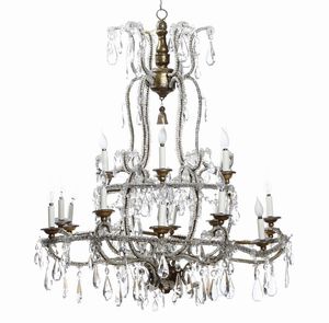 Lampadario a dodici luci in metallo sbalzato e argentato con pendenti in cristal [..]
