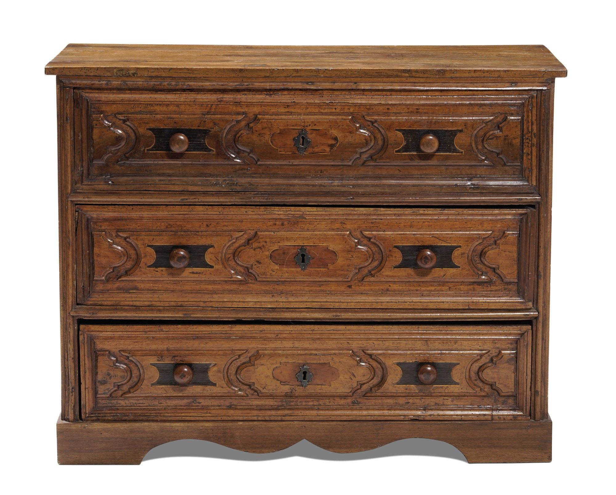 Coṃ in noce intagliato a tre cassetti. XVIII secolo