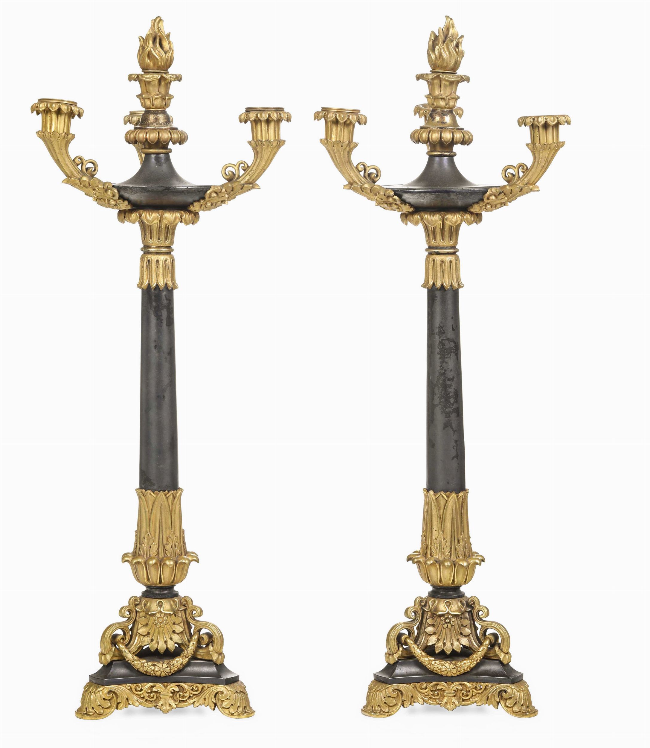 Coppia di candelabri in bronzo patinato e dorato, XIX secolo