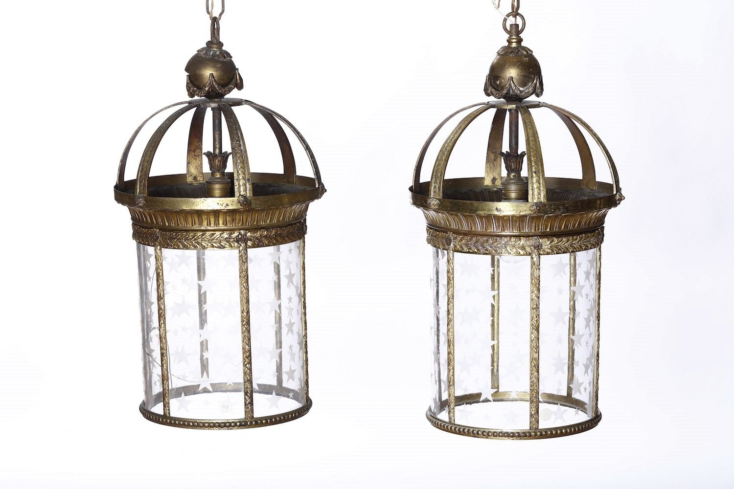 Coppia di lanterne in ottone, paralume in vetro decorato a stelle. XIX-XX secolo