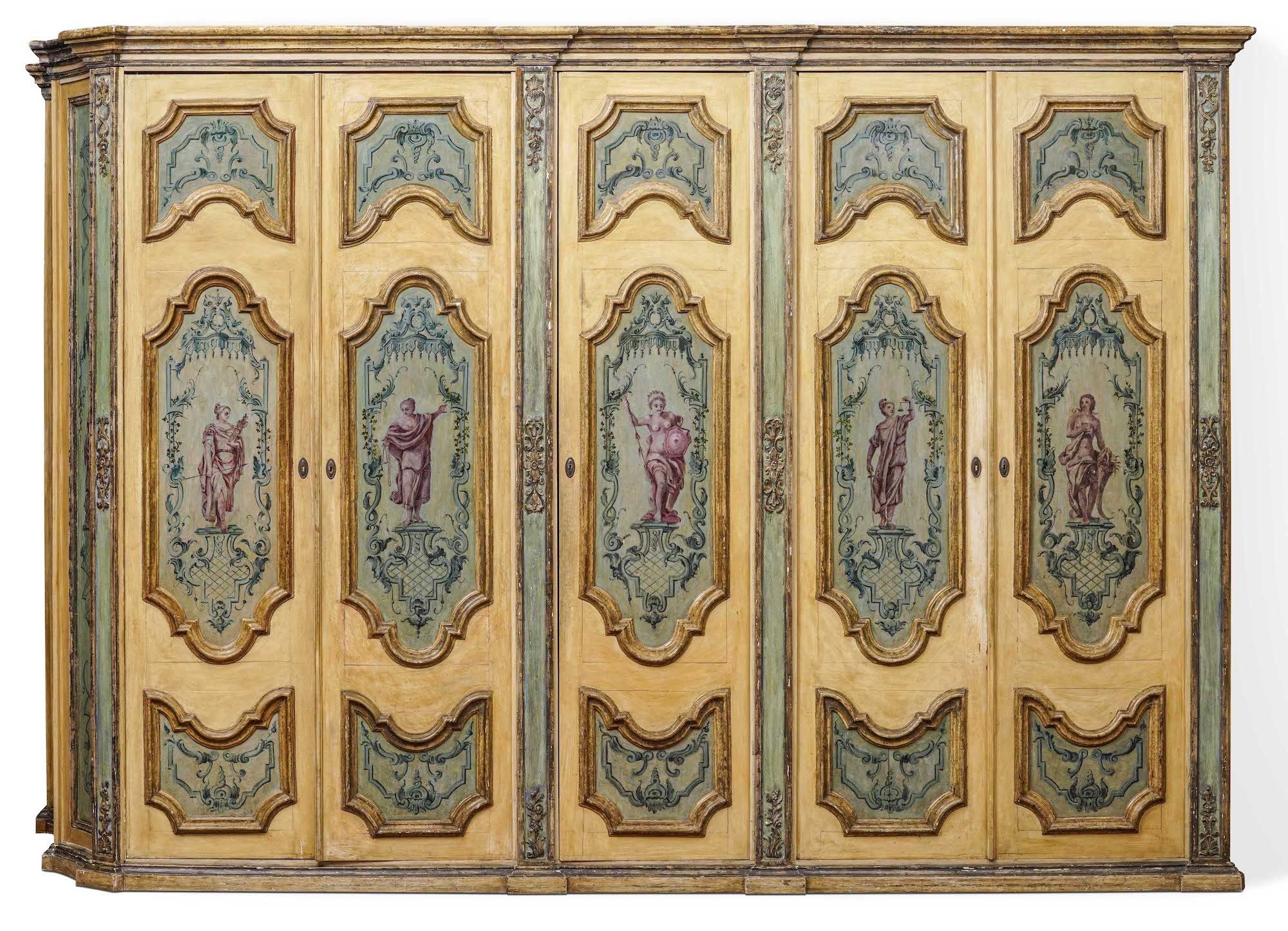 Cinque ante decorate con riserve sagomate e dorate che incorniciano figure classiche, Napoli, XVIII-XX secolo (mancanze e ridipinture)