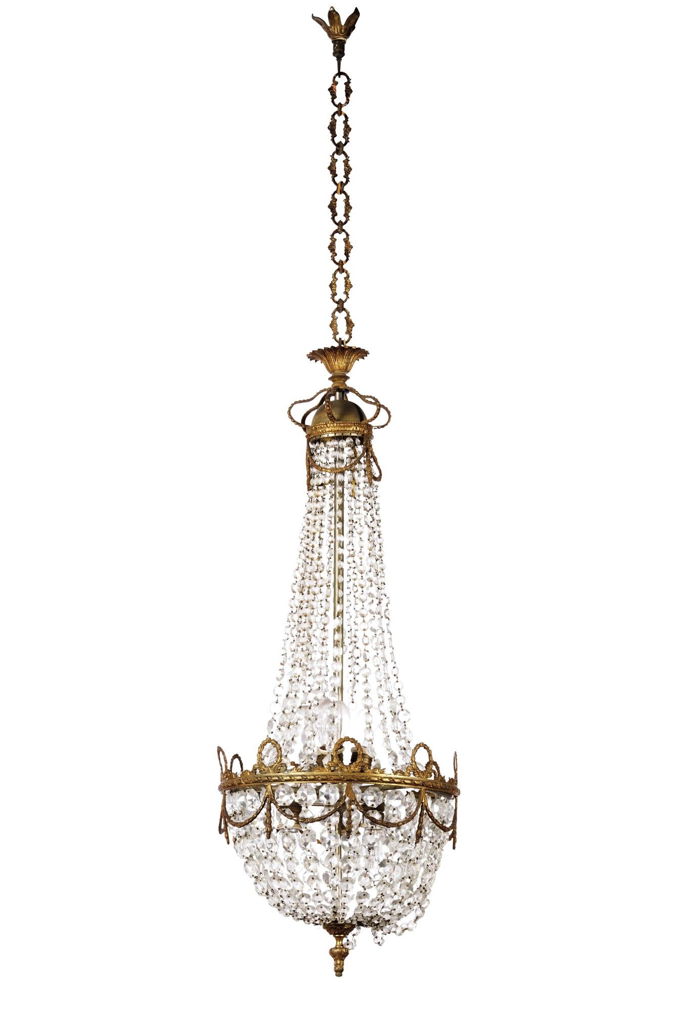 Lampadario a mongolfiera in bronzo dorato e cristalli. XIX secolo